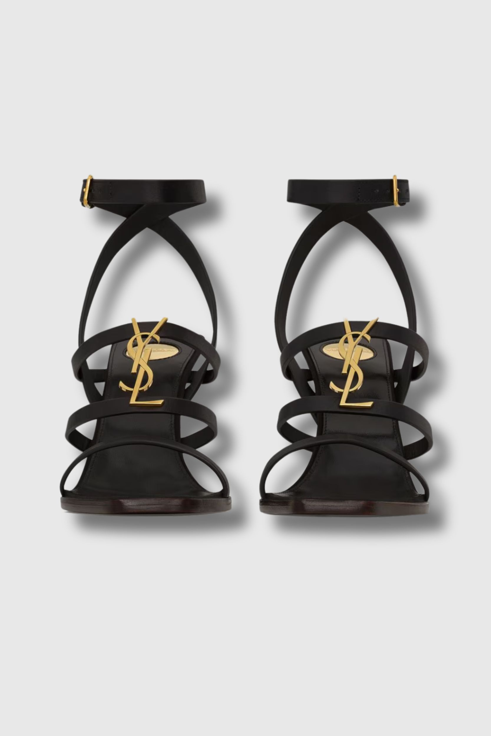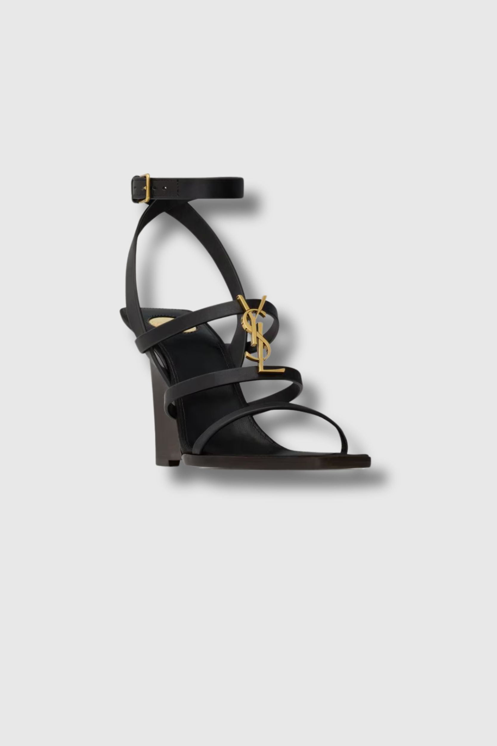 These black calf leather Cassandre wedge sandals are designed by Saint Laurent. They feature several adjustable straps, a square toe and are detailed with gold Cassandre on the front.
