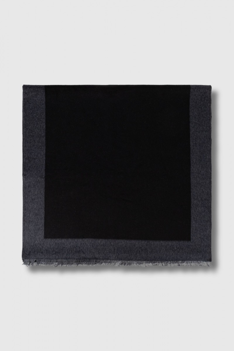 This large YSL logo scarf by Saint Laurent embodies timeless elegance in its purest form. Rectangular and deep black, highlighted by a dark grey border, it emphasises the simplicity and harmony of the piece. Made entirely of silk, with an exceptionally soft feel and a slight natural sheen, it wraps around the silhouette with fluidity. The subtly frayed edges give it a contemporary touch while ensuring it adapts perfectly to different outfits. The absence of a visible logo reinforces the refinement and versatility of this discreet accessory.