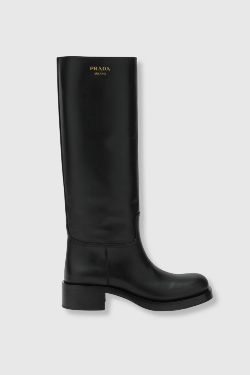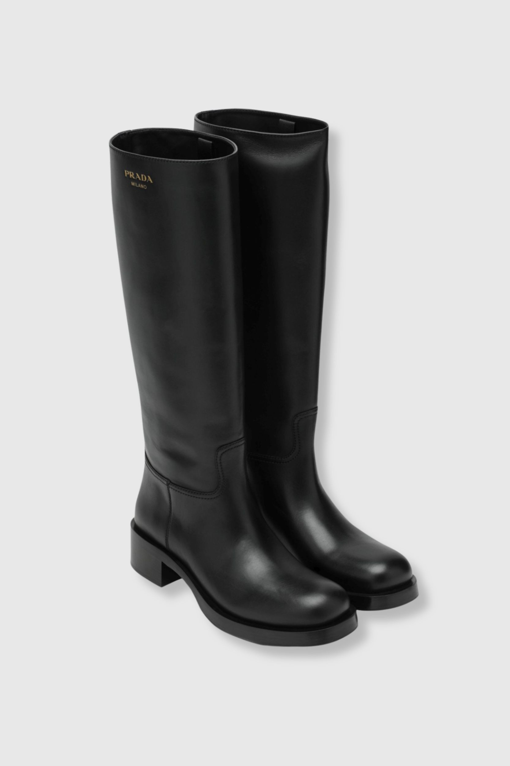 Prada black leather boots featuring a sleek, contemporary silhouette and expert Italian craftsmanship. These boots are crafted with a tall structured shaft, a stable block heel and a lug sole for confident steps in any setting. The premium smooth leather and refined finishes elevate the design, while the timeless black hue makes them easy to style with urban, tailored or casual looks.