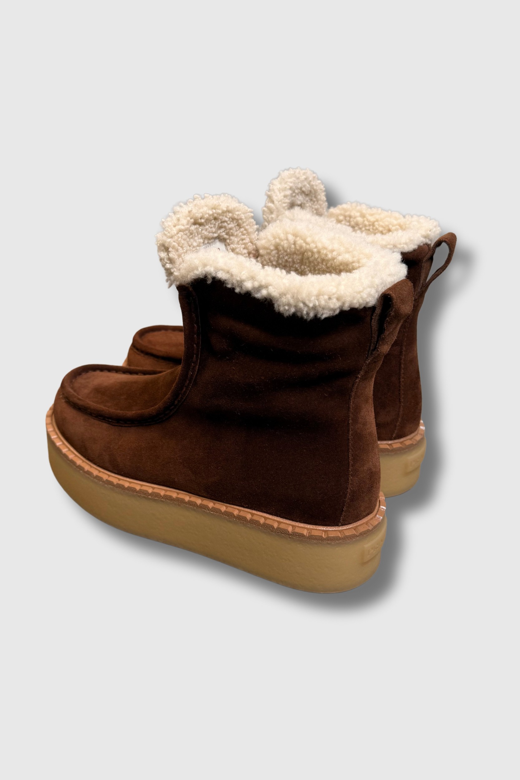 The Evolve boots by Prada combine luxurious comfort with modern elegance. Crafted from rich brown suede, they feature a soft shearling lining that provides exceptional warmth and comfort. The tonal rubber platform sole ensures a contemporary look with everyday wearability. Detailed with the iconic Prada triangle logo on the side, these boots embody Italian craftsmanship and effortless sophistication.