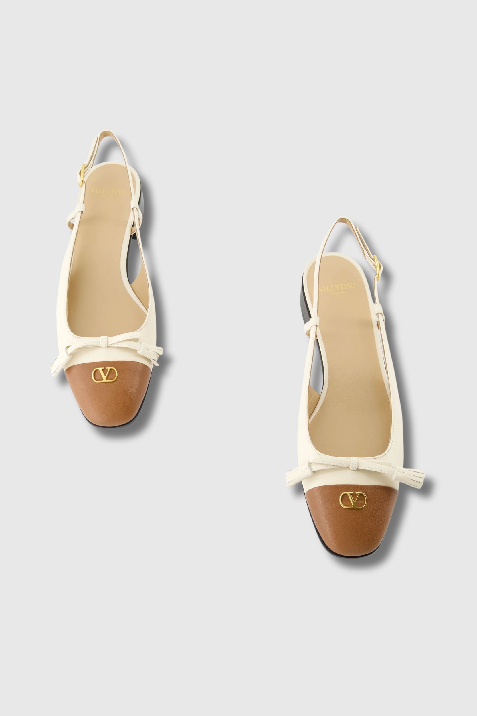 The Valentino Garavani leather ballet flats in beige offer timeless elegance and comfort. Made from supple kid leather, they feature a rounded toe, an adjustable ankle strap, and a delicate bow with leather pom-poms for a feminine finish. The raised V-Signature logo and leather edging emphasize the brand’s authenticity and Italian craftsmanship. With a leather insole and outsole, these flats ensure lasting wear and flexibility. Crafted in Italy, they reflect Valentino’s refined and understated signature style.