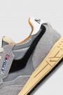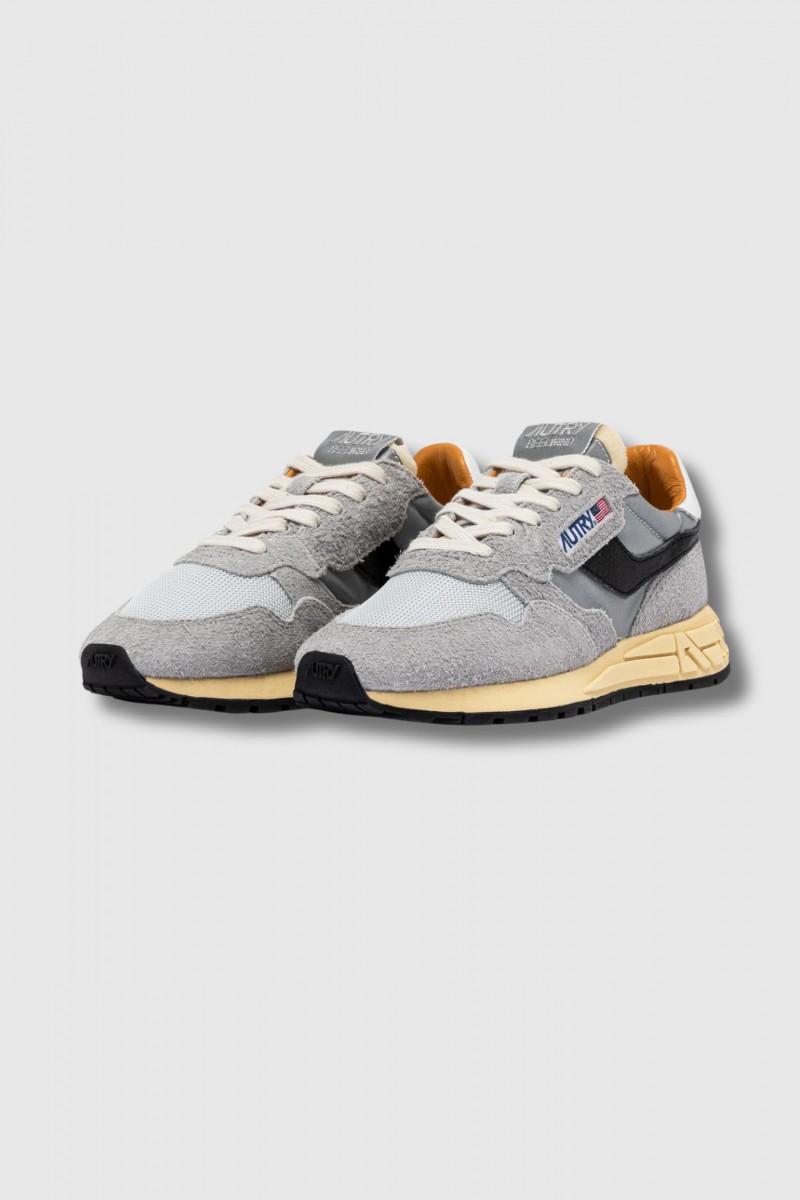 These grey Reelwind trainers by Autry combine the brand's sportswear DNA with retro 80s running inspiration. Their sleek silhouette ensures lightness, flexibility and excellent grip for everyday wear. Made from reflective grey nylon, they are enhanced with suede and crackled leather inserts in sandy tones for a dynamic and refined look. The rubber and Phylon running sole guarantees optimal cushioning. Featuring a mesh toe cap, flat cotton laces, a padded collar and a lining in pigskin, terry cotton and nylon, they offer comfort and lasting style.