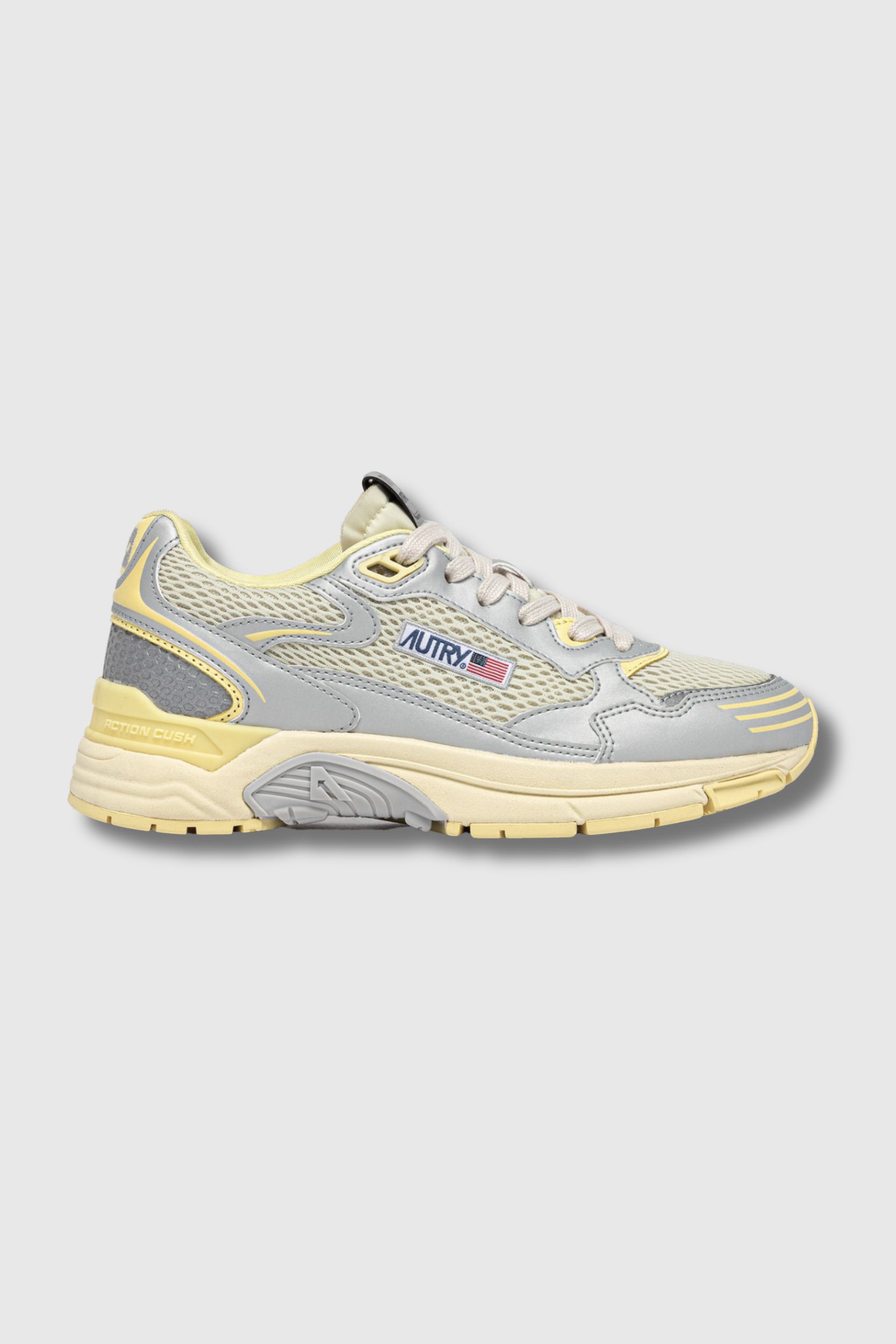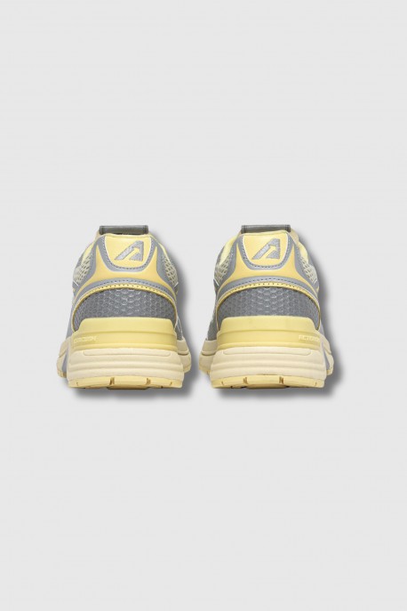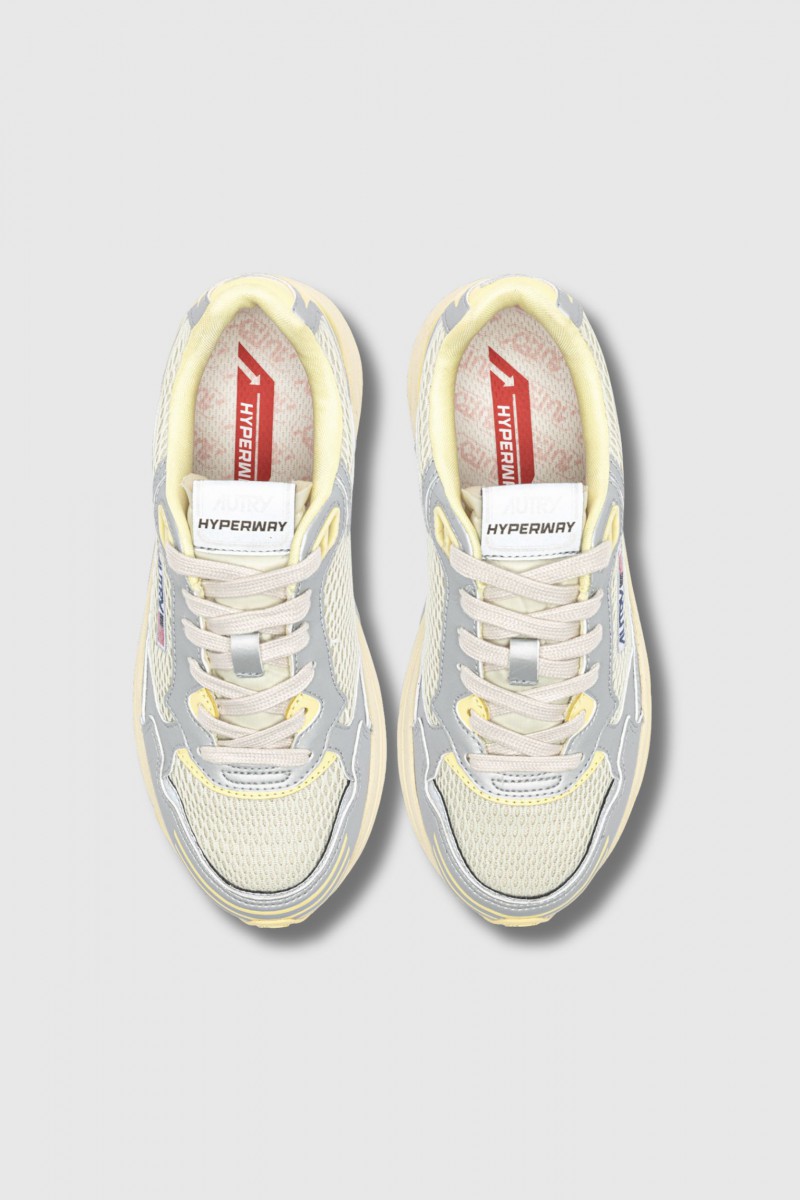These Hyperway sneakers in silver/yellow mesh and suede by Autry combine running style with urban aesthetics. The upper combines lightweight, breathable mesh with suede panels for optimal comfort and a sophisticated touch. The sole features Action Cush technology for superior cushioning and a comfortable walking experience. The nylon tongue, embossed leather heel counter, jacquard label, and side logo highlight the authenticity of the model. Finishing touches include a mesh toe, flat cotton laces, a padded mesh collar, and a cotton terry lining.