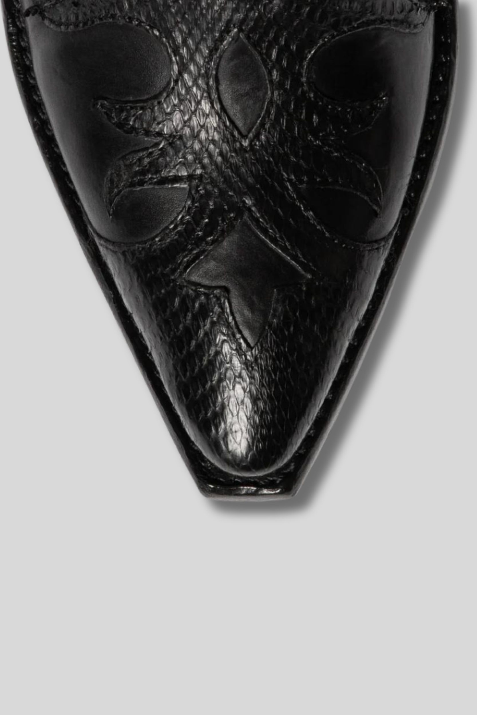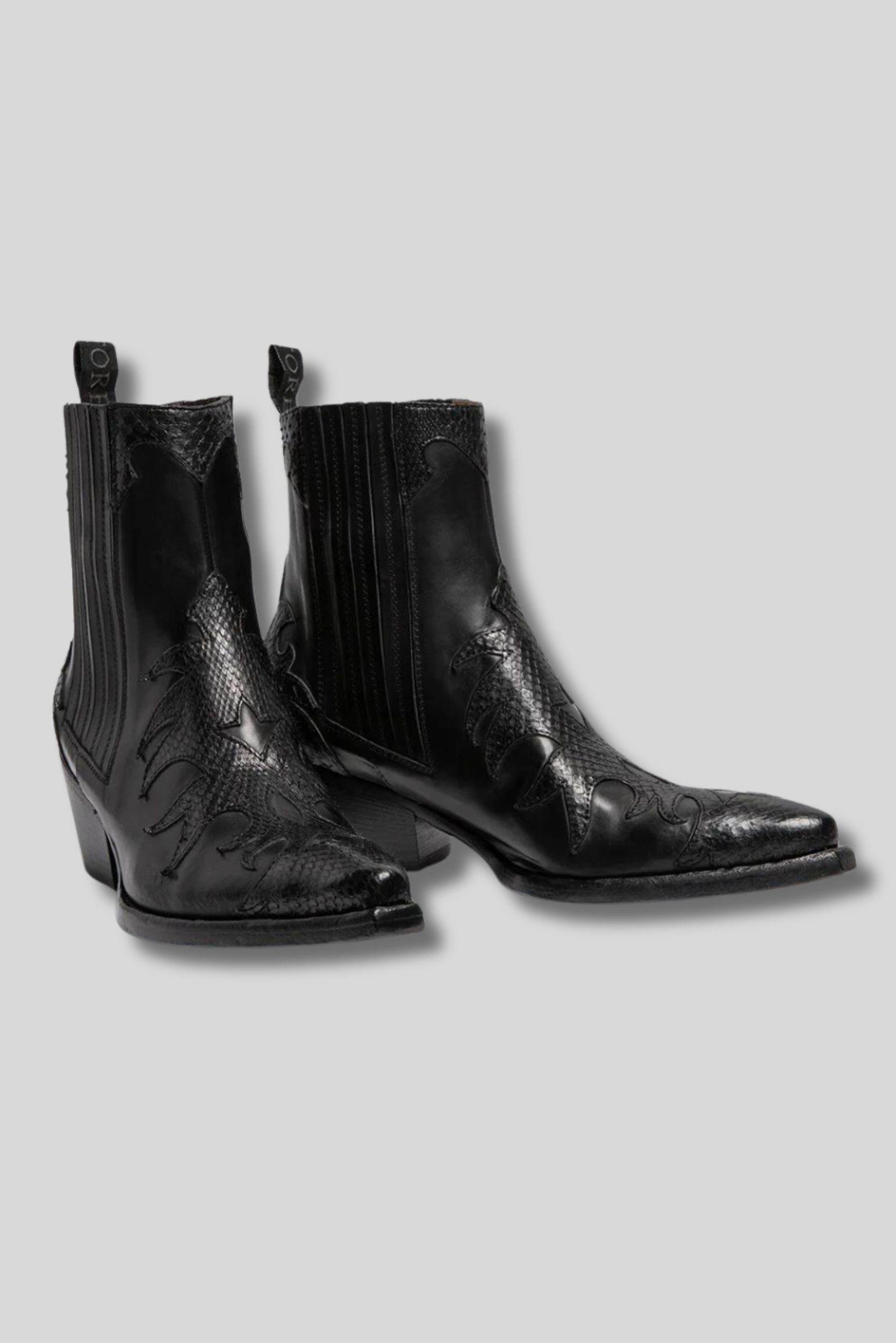 These black leather boots with python inlays are designed by Sartore. They feature flame-shaped "stonewashed" cutouts for a vintage look. The boots are equipped with a leather sole stitched using the Blake technique.