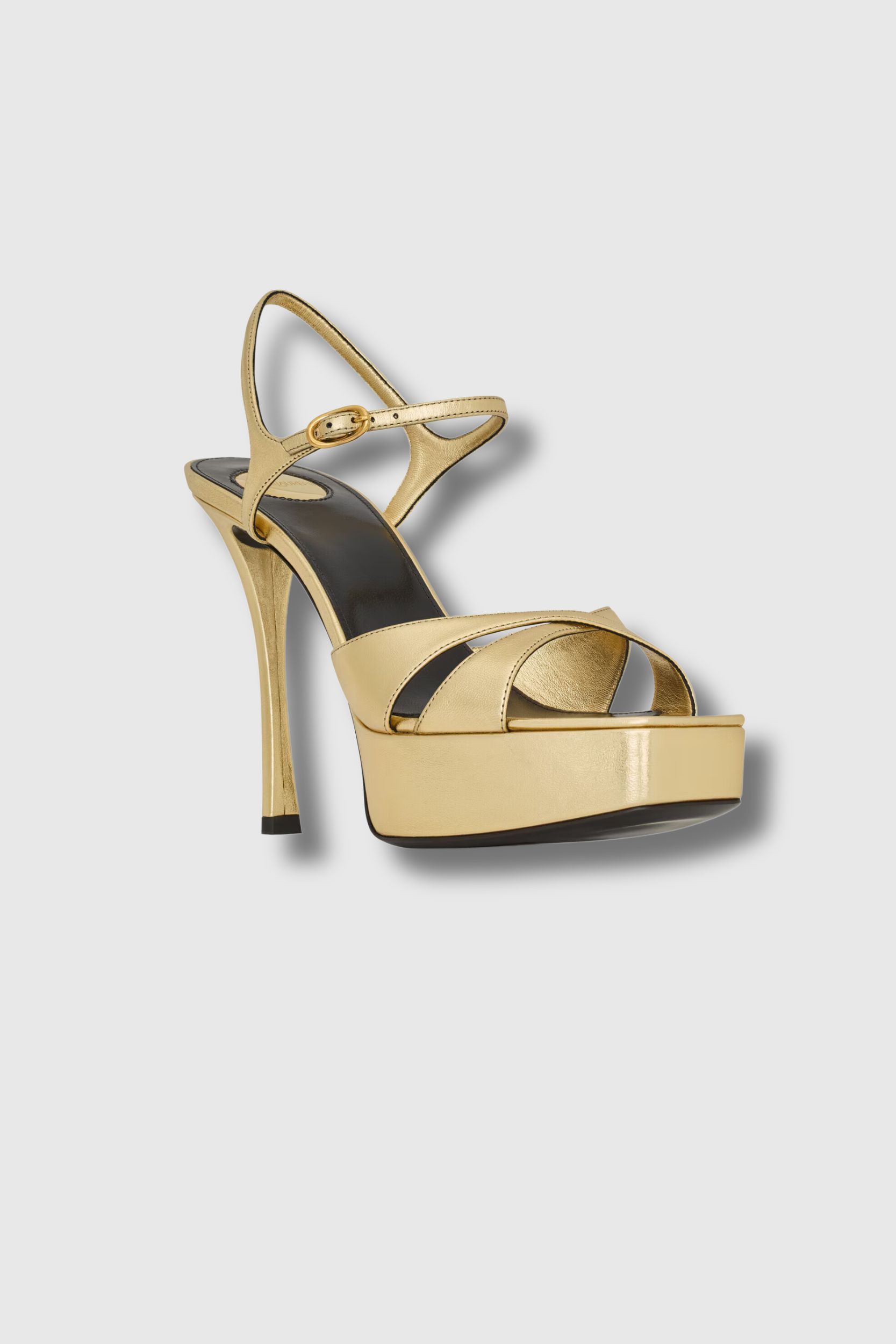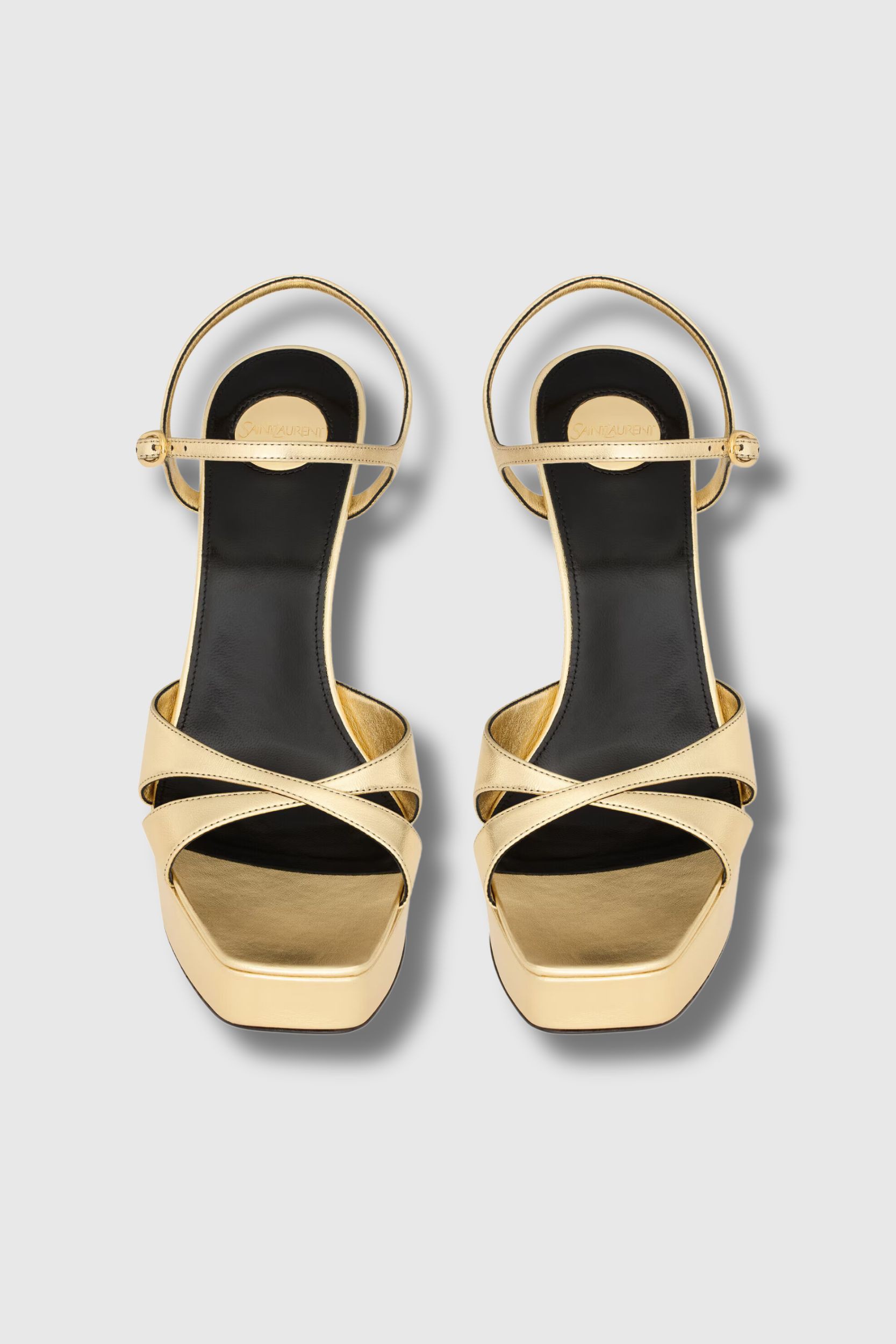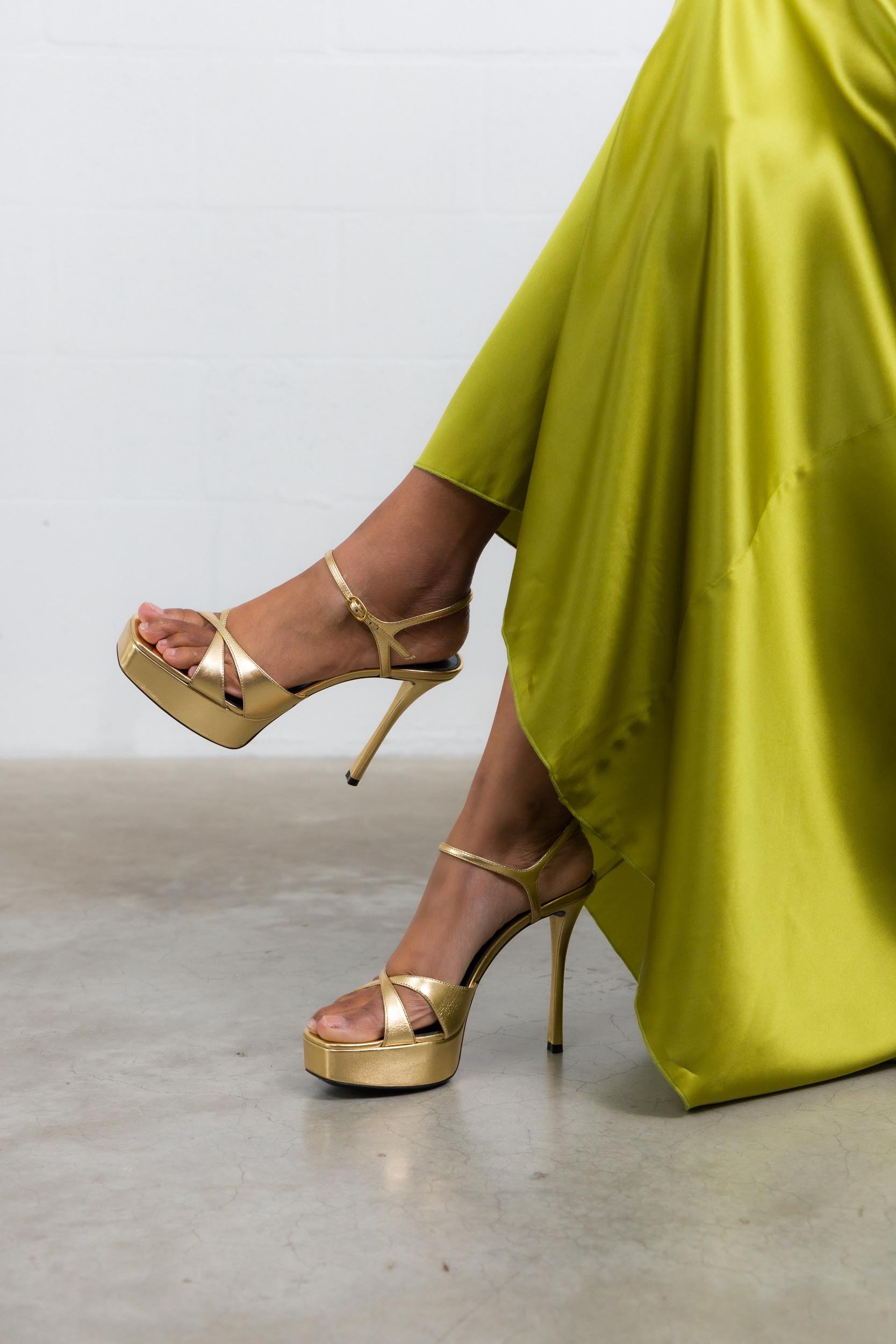 These gold metallic lambskin leather Debbie platform sandals are designed by Saint Laurent. These are detailed with adjustable crossover straps and a stiletto heel.