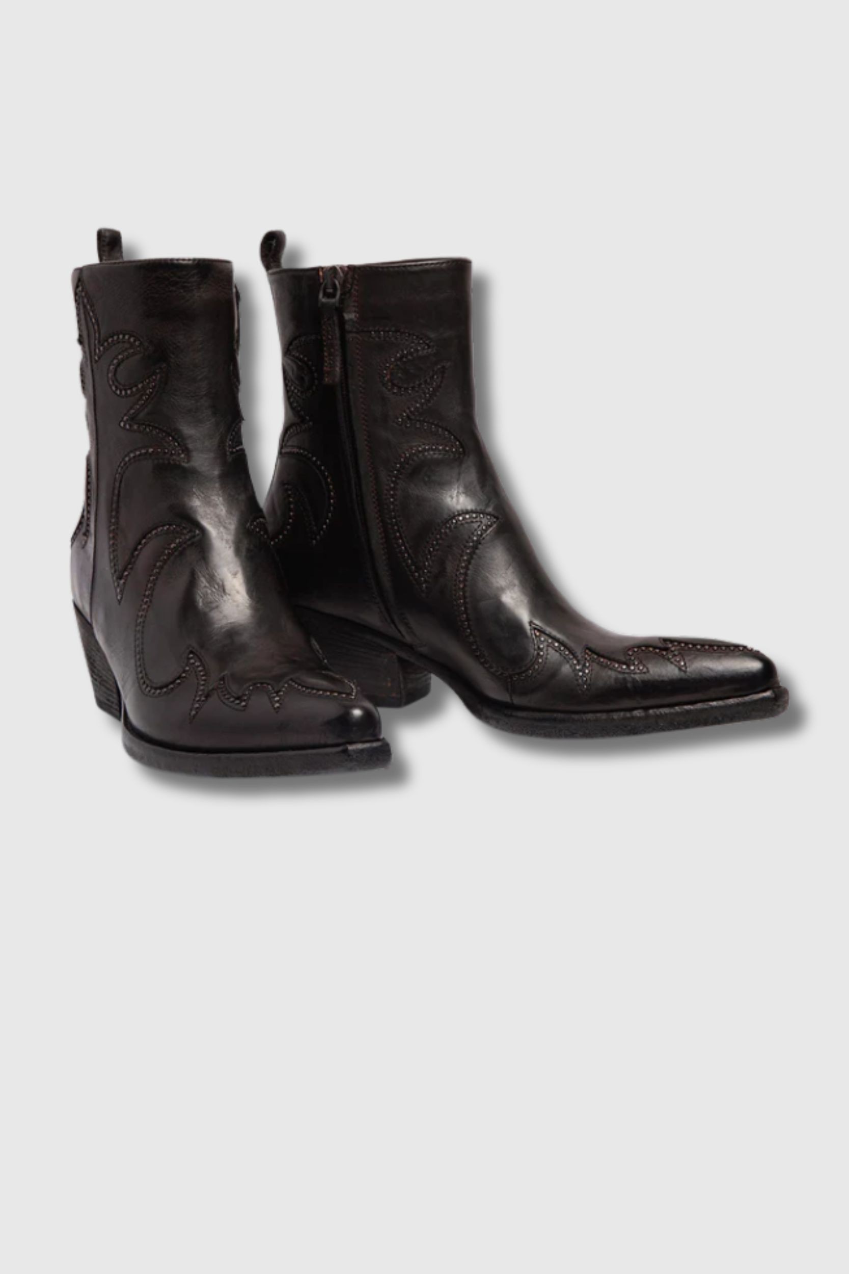 These brown worn leather Santiags are designed by Sartore. They feature a pointed toe and ankle height. These shoes are detailed with studs and flame cut-outs.