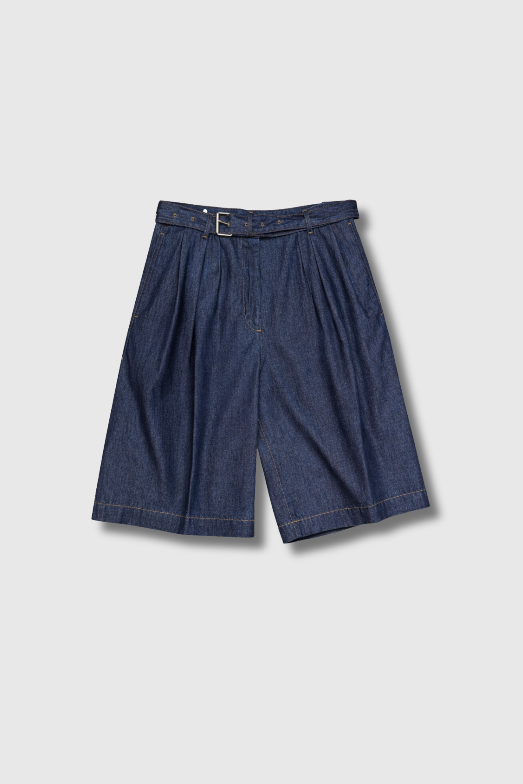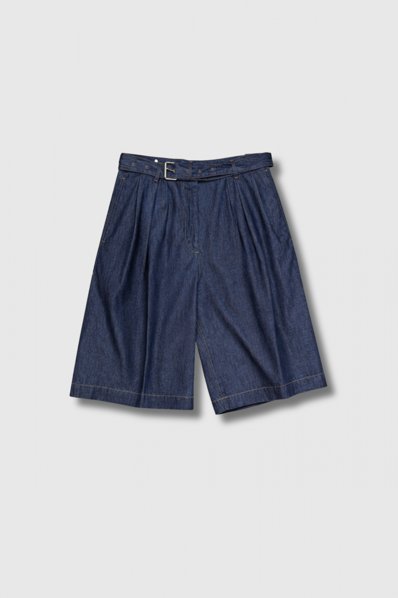 These Peaches pleated denim Bermuda shorts by Dries Van Noten stand out for their structured, contemporary look. Crafted from denim, they feature a loose, high-waisted fit with straight legs, enhanced by irregular pleats that add volume and character. Featuring slit side pockets, piped back pockets and an integrated waistband, they fasten at the front for a clean finish. A statement piece with casual elegance, faithful to the brand's architectural aesthetic.