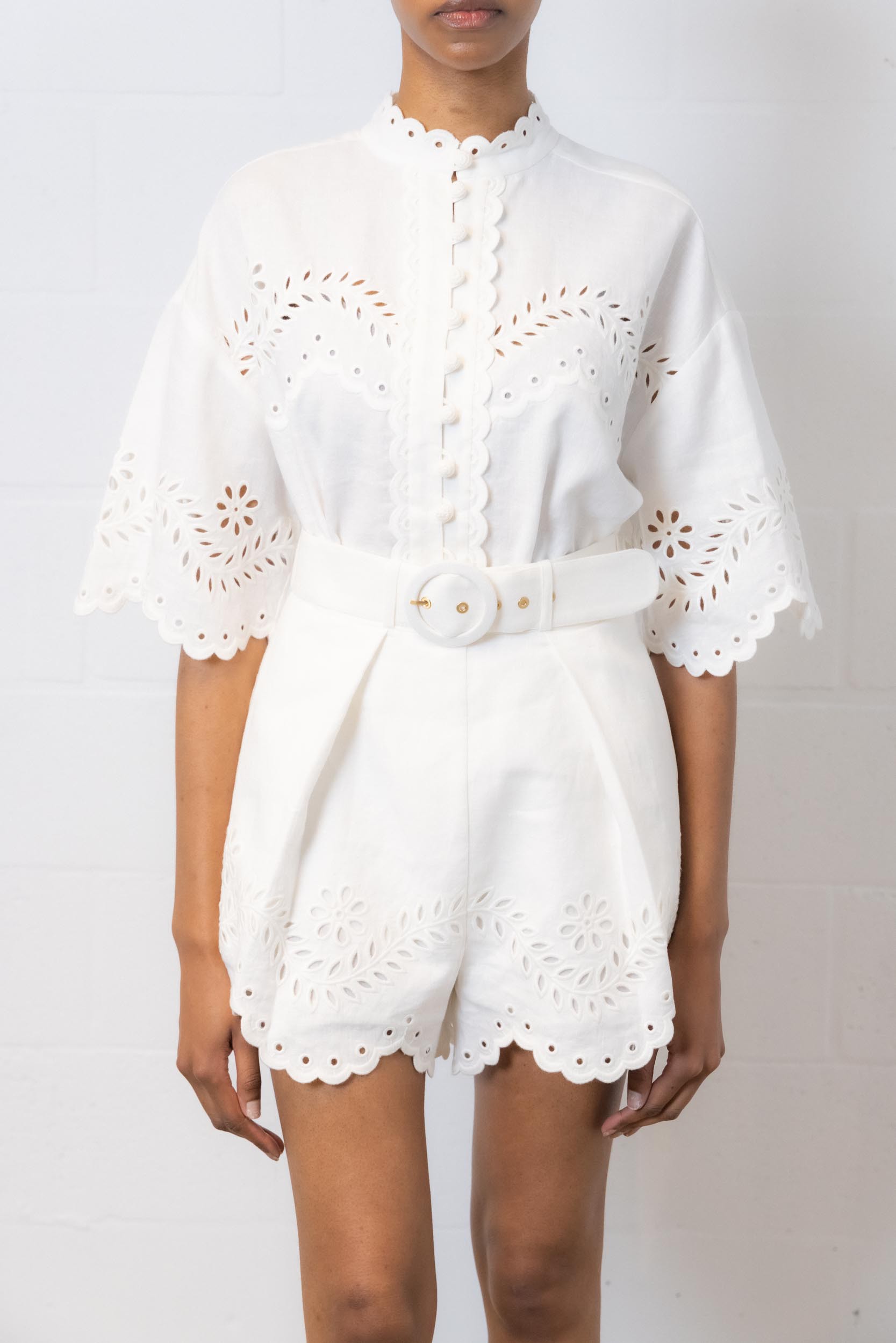 These embroidered white linen shorts are designed by Zimmermann. It has a flared cut with a high waist and features floral embroidery. These shorts feature a matching buckle belt.