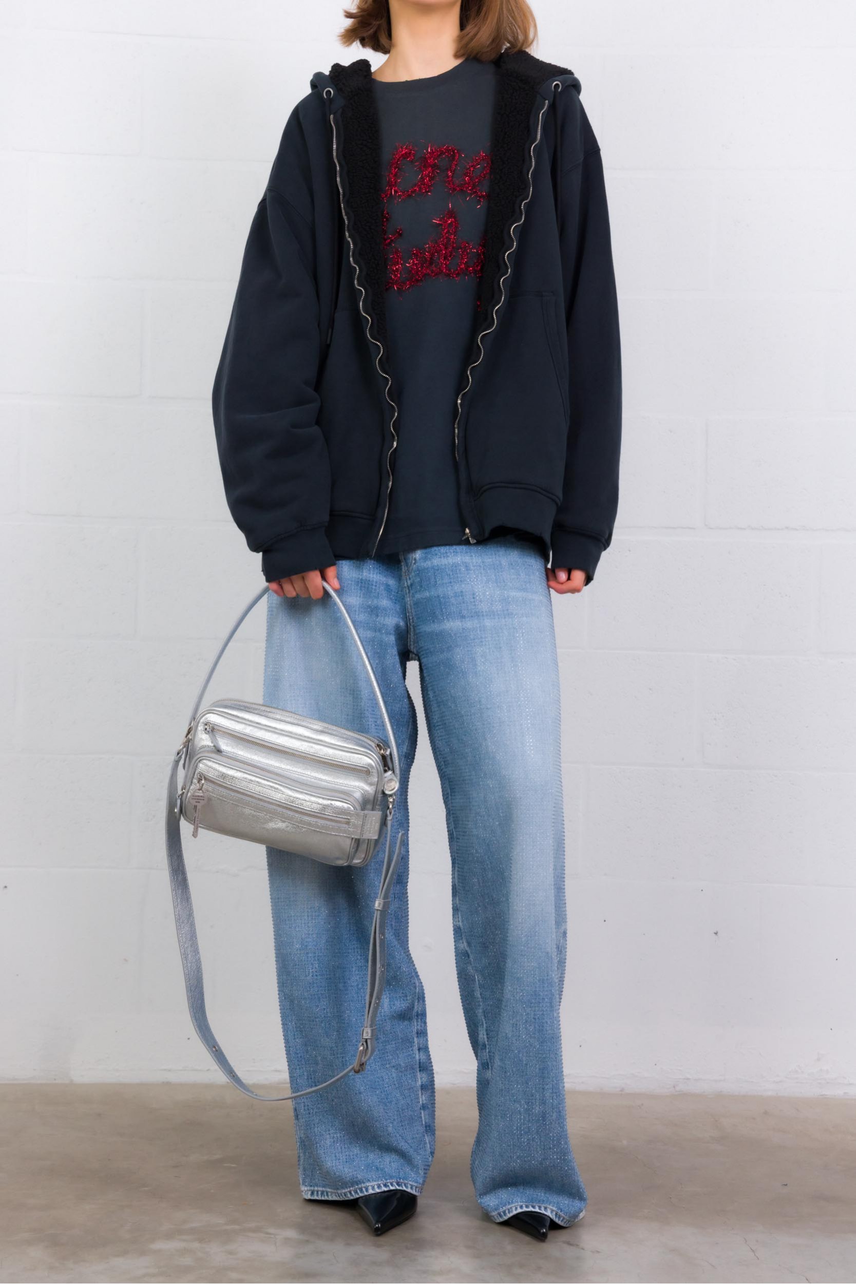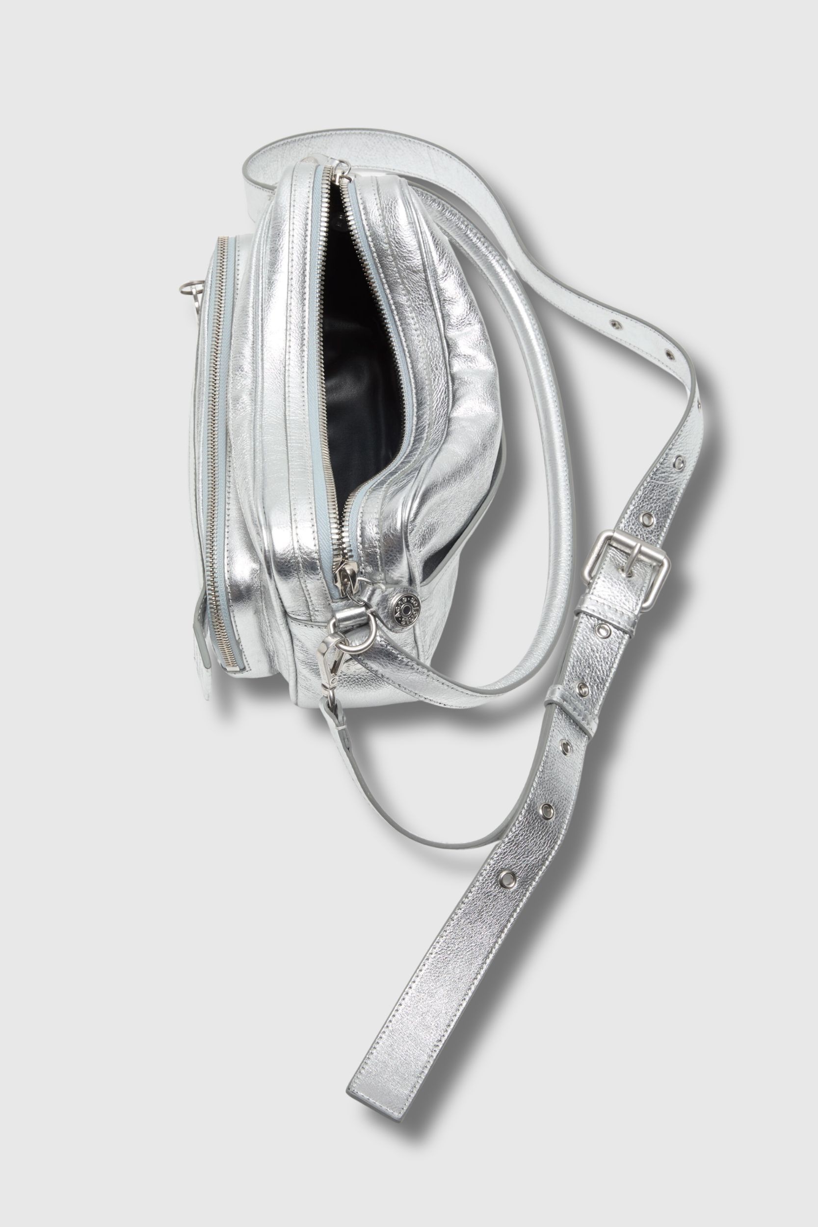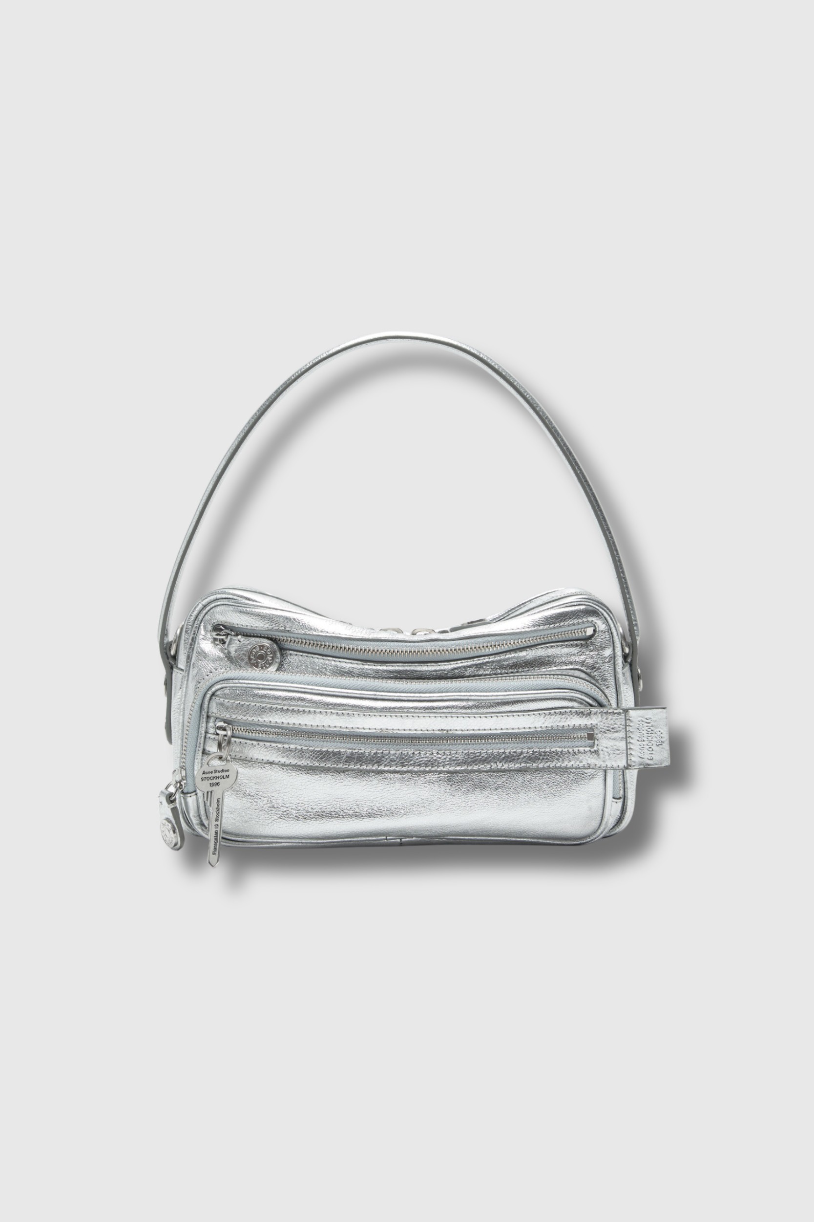 This Camero shoulder bag in metallic silver leather by Acne Studios captivates with its compact, structured silhouette. Crafted from shiny small-grain leather with a metallic finish, it features multiple zipped compartments, a branded key charm, and signature details inspired by denim style. Practical and versatile, it can be worn over the shoulder or across the body thanks to its handle and adjustable strap.