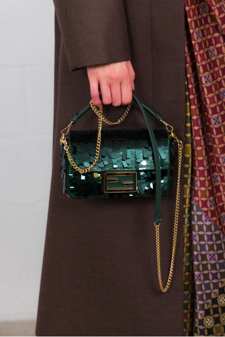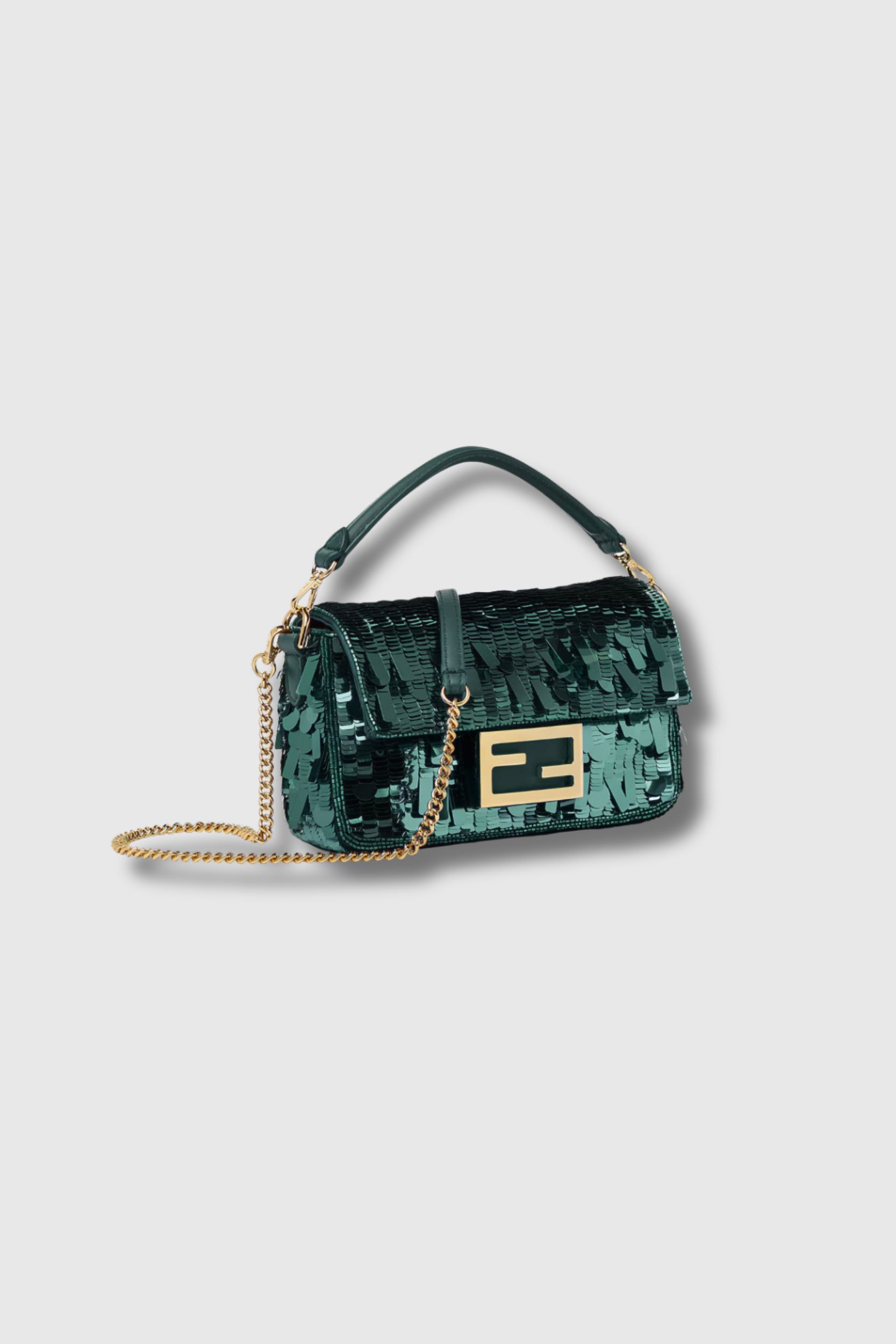 This small bottle green Baguette bag is designed by Fendi. An icon of the House, it features hand-embroidered green sequins in various shapes and sizes, enhanced with tone-on-tone calfskin leather trim and the iconic FF clasp. Its front flap opens to reveal a pink satin-lined interior with a leather pocket, while gold-tone metal hardware adds a touch of elegance. The handle and chain shoulder strap, both removable, offer several carrying options: by hand, on the shoulder or across the body. Compact yet functional, it can hold a 6.7-inch smartphone, a card holder or mini wallet, keys and lipstick.