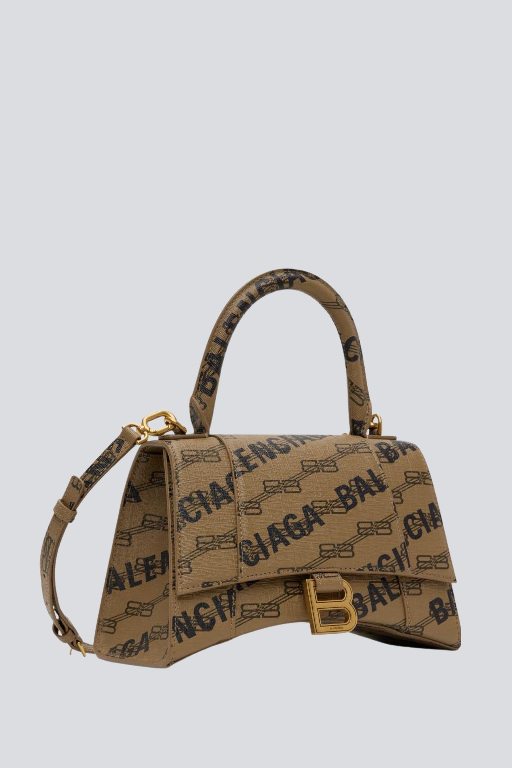 This Hourglass Small bag in beige leather is designed by Balenciaga. It features an allover black logo print and an aged gold-tone metal B logo at the front.