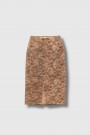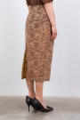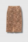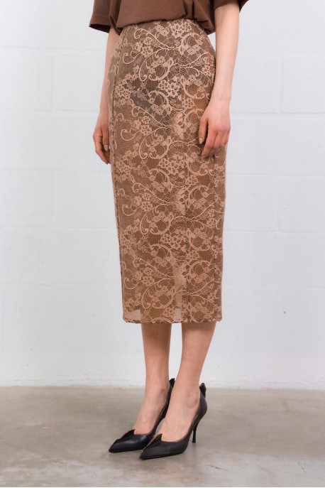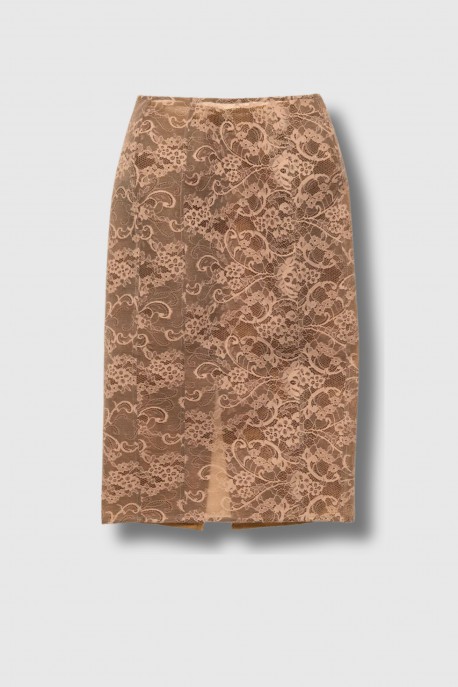This bronze and brown lace midi skirt is by Acne Studios. Crafted from lace with an integrated lining, it features a straight, regular fit that creates an elegant silhouette. Its mid-length design and back slit provide comfort and ease of movement, while the delicate lace texture adds a refined and contemporary touch.