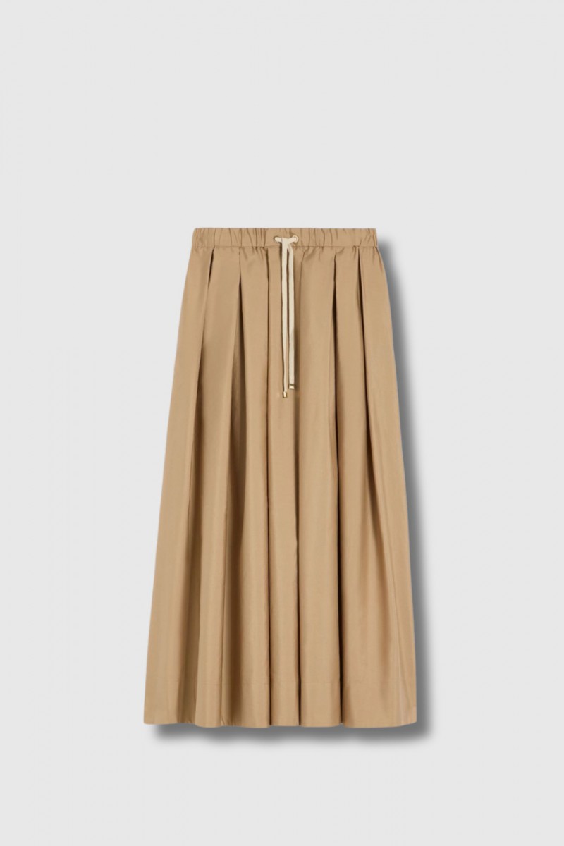 This Pineta long pleated skirt in beige washed cotton is by Max Mara. Crafted from pure cotton poplin, it features a voluminous A-line silhouette with pleated detailing that adds movement. Designed with an elastic waistband and contrasting drawstring with metal tips, it combines comfort and elegance. The skirt is finished with side pockets and a flared hem, creating a fluid and modern silhouette.