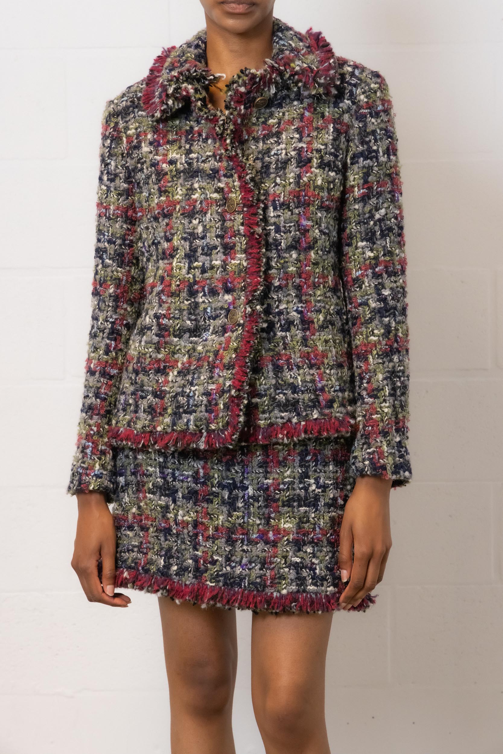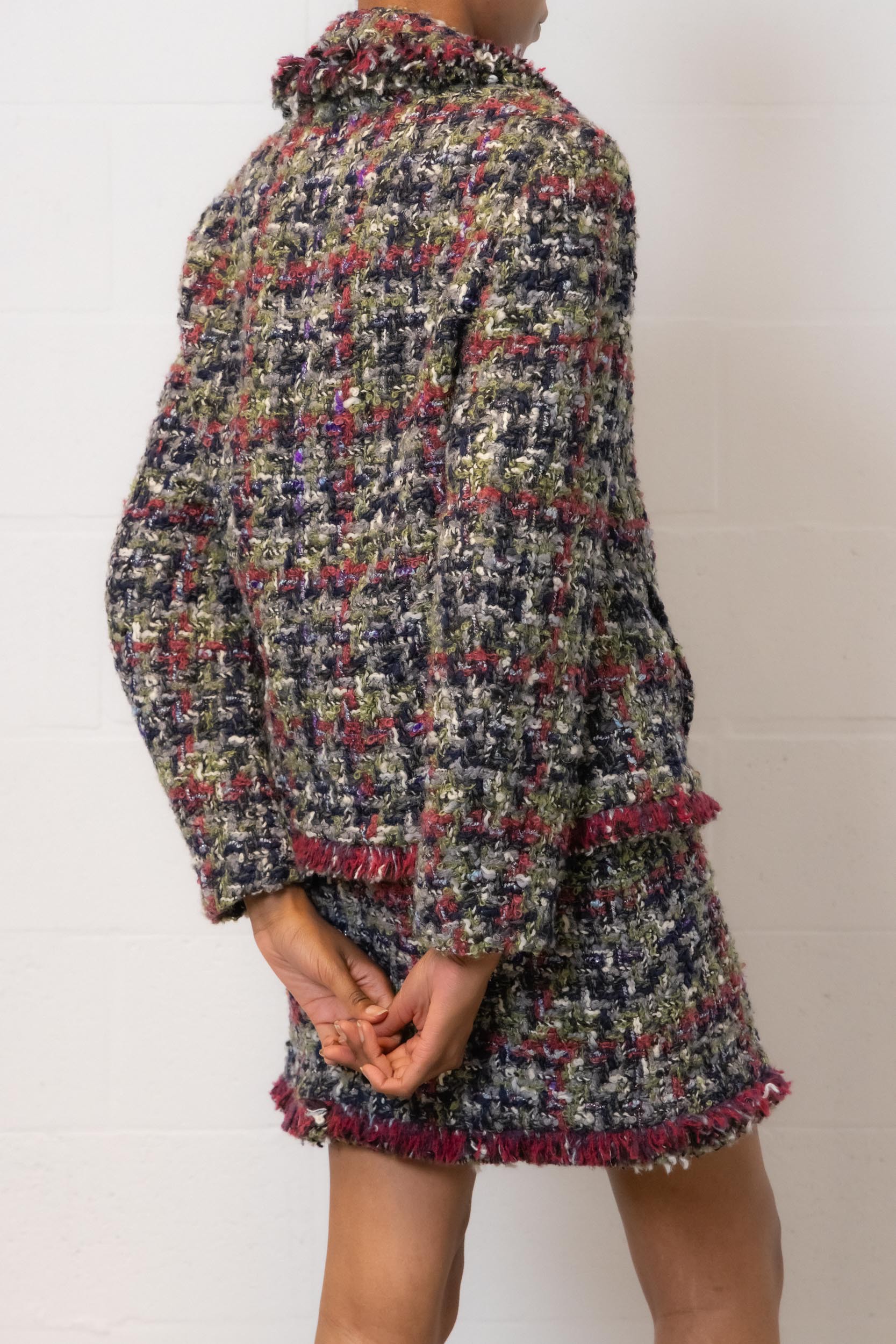 This green, pink and grey tweed mini skirt designed by Etro has a zip fastening at the back and a straight cut.