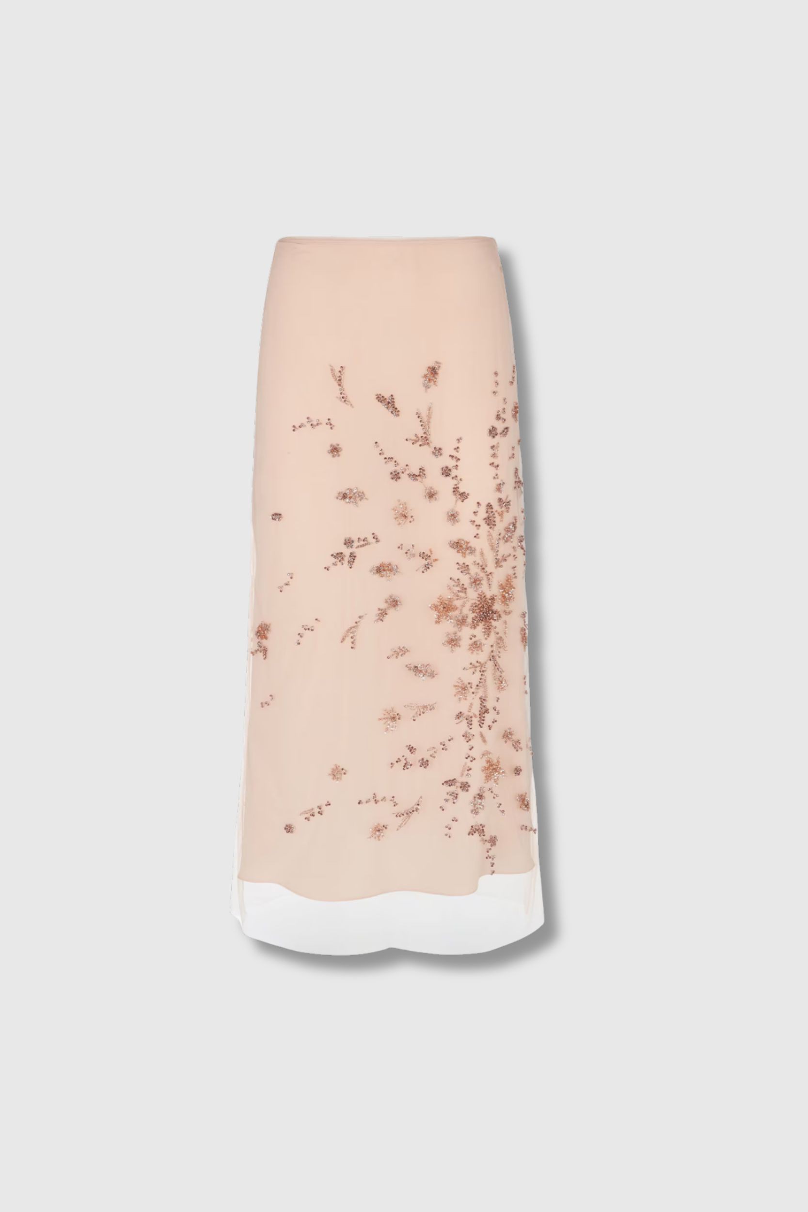 This Fendi skirt is midi-length with a straight cut, crafted from pink tulle. It features a side zip closure. One side is adorned with a floral motif, delicately embroidered with sequins, micro jet beads, fine pearls, and crystals. The skirt is lined with a matching underskirt, finished with a slightly shorter asymmetrical hem.
