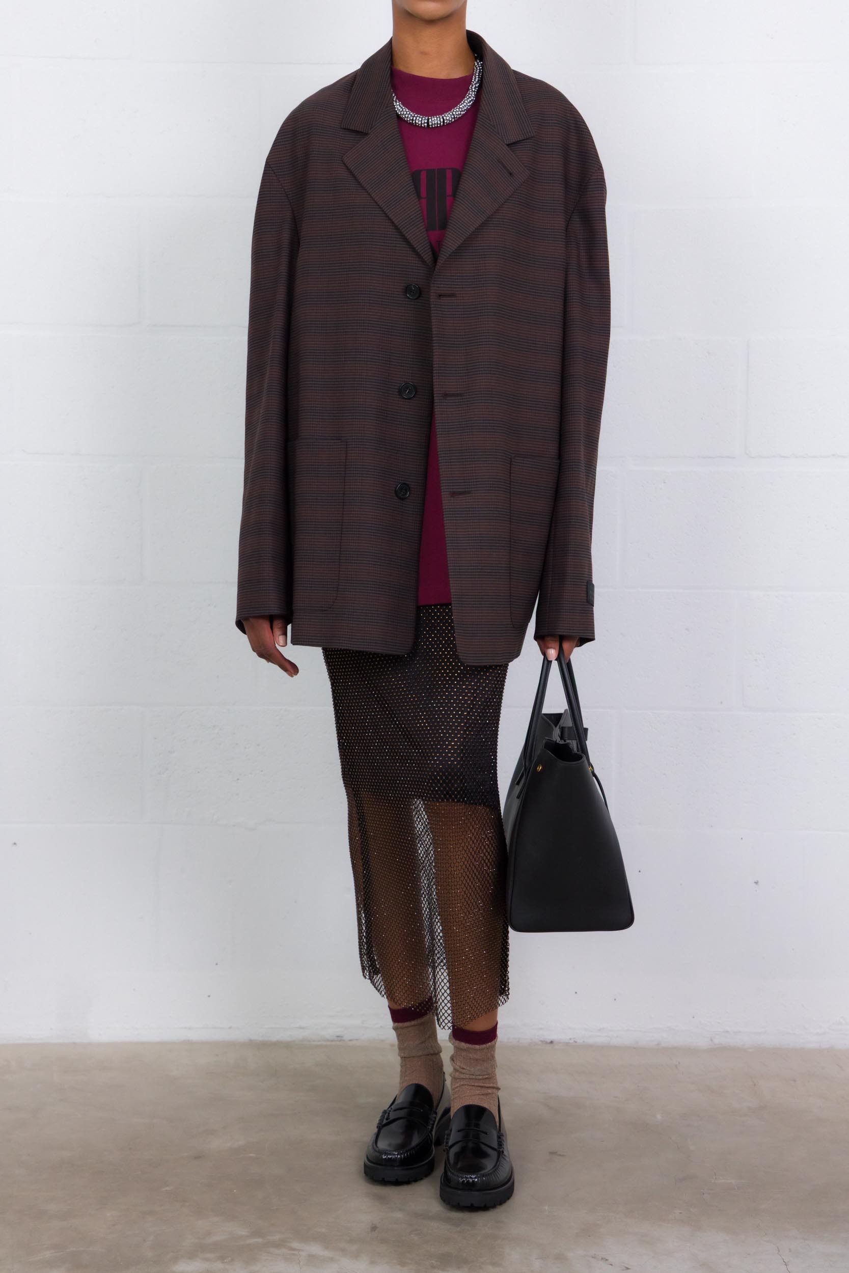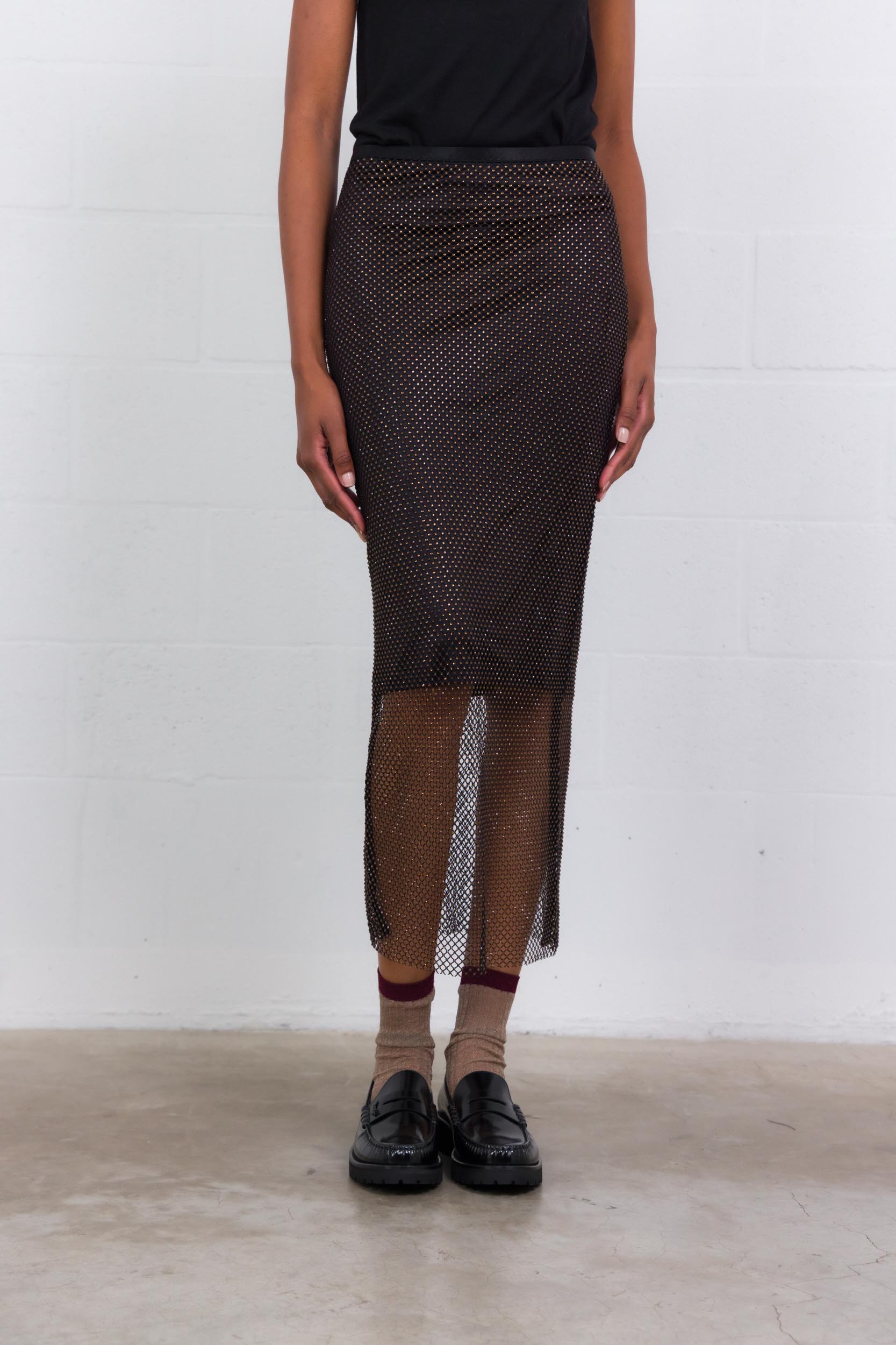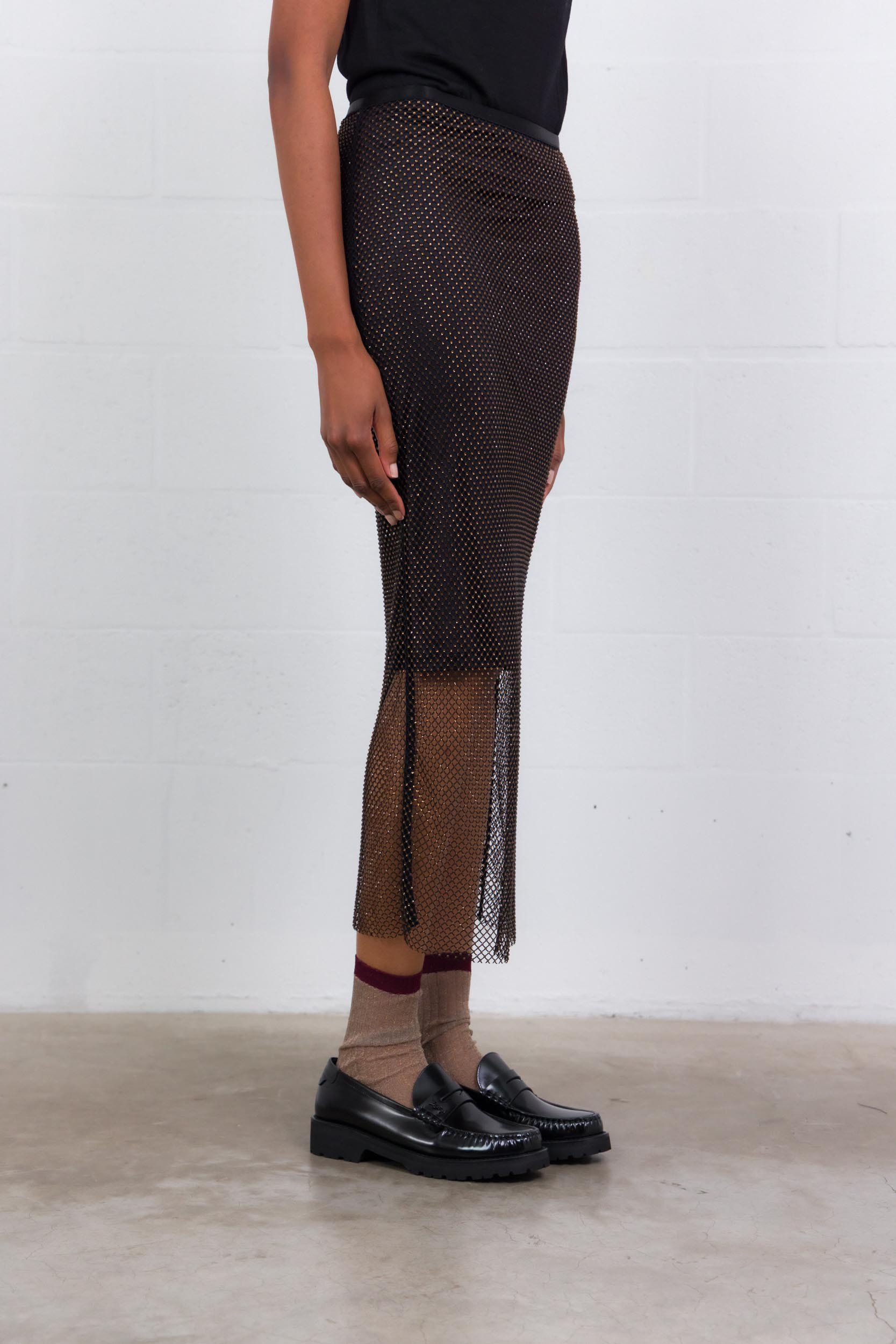 Elevate your outfits with this MaxMara “Rete” skirt, adorned with delicate black and dark brown rhinestones that elegantly catch the light. Its straight, flowing cut and elastic waistband ensure optimal comfort, while its midi length adds a sophisticated and contemporary touch.
