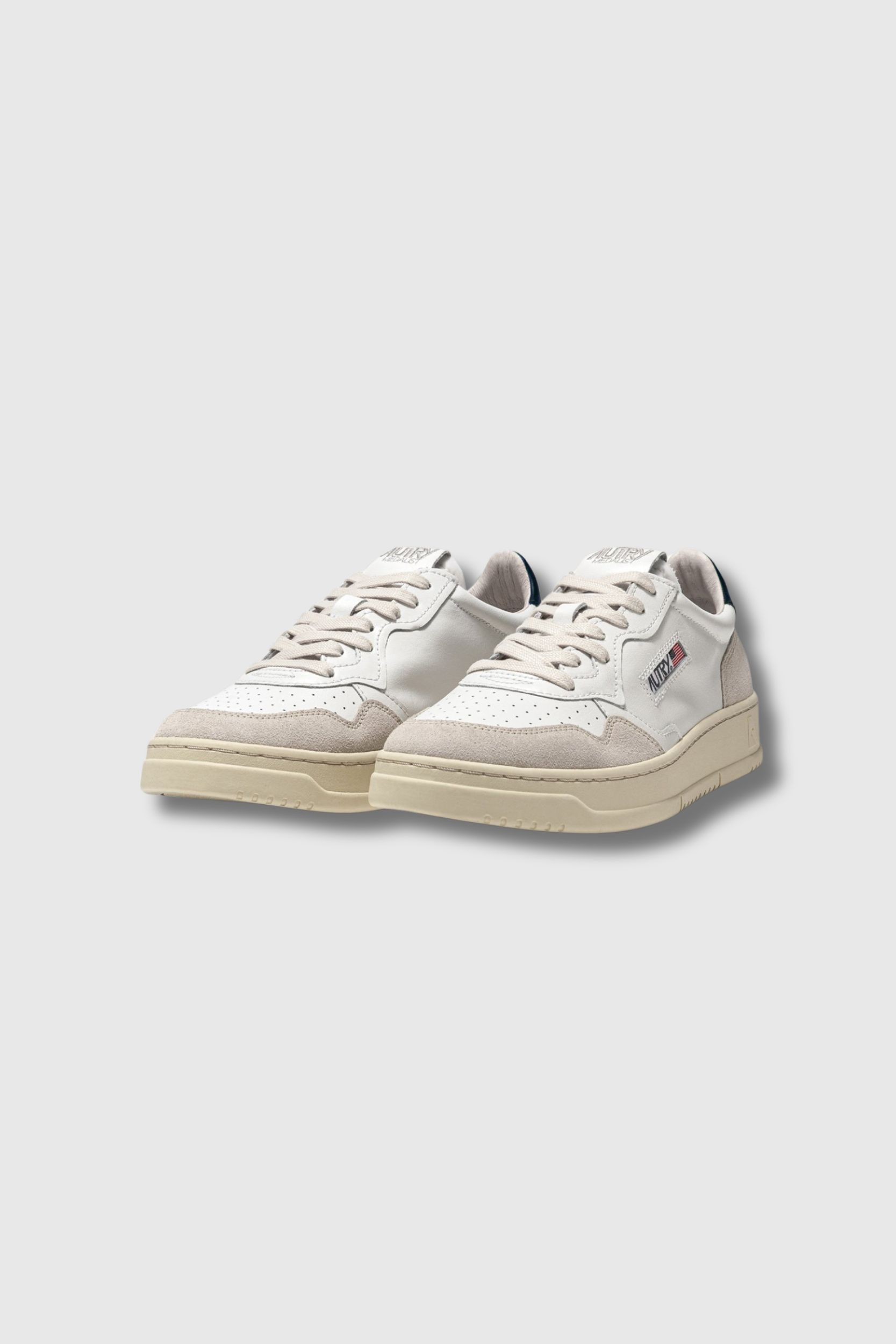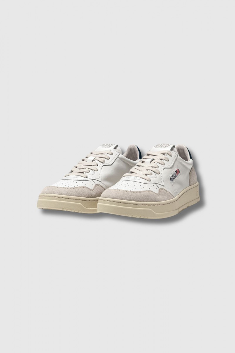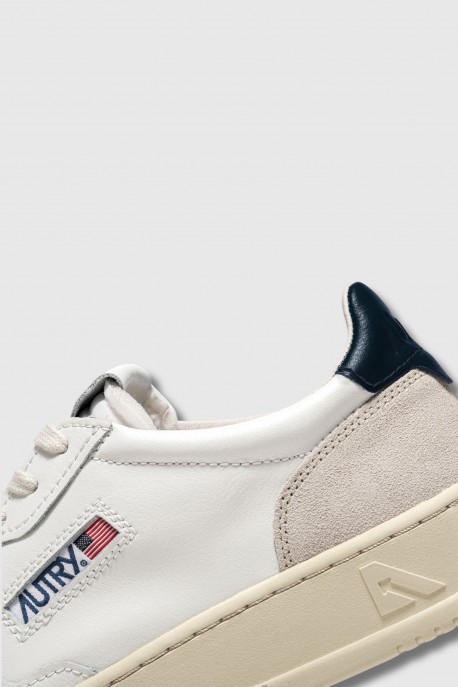 These Medalist Low trainers in white leather, blue and beige suede by Autry revisit the tennis aesthetic of the 1980s with modern proportions and quality materials. Crafted from supple white leather with an authentic look, they are enhanced with beige suede reinforcements offering a tactile and graphic contrast, while a blue leather insert customised with the Autry logo adorns the heel. Micro-perforations at the front ensure optimal breathability, complemented by flat cotton laces, an embroidered label sewn onto the tongue and a padded collar. The leather and cotton terry lining guarantees lasting comfort for everyday wear.