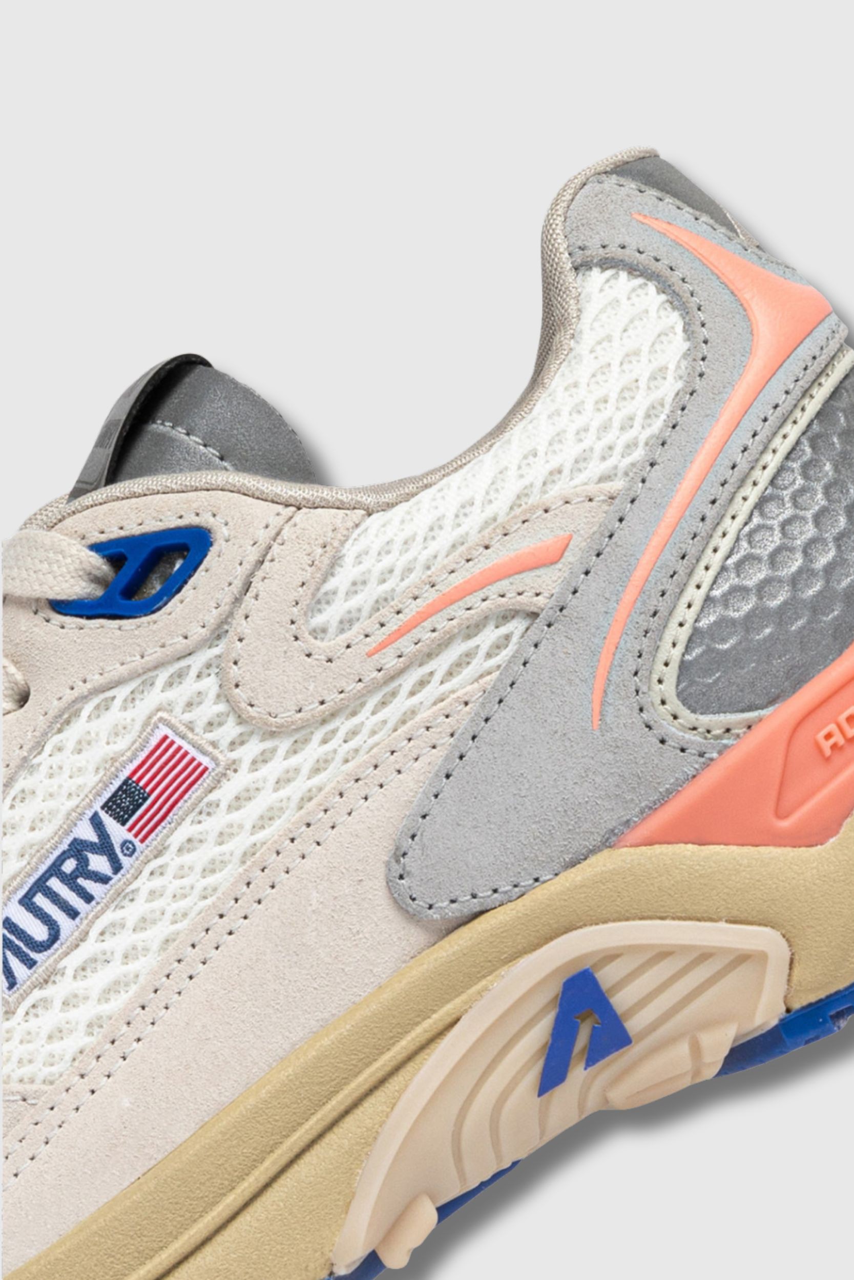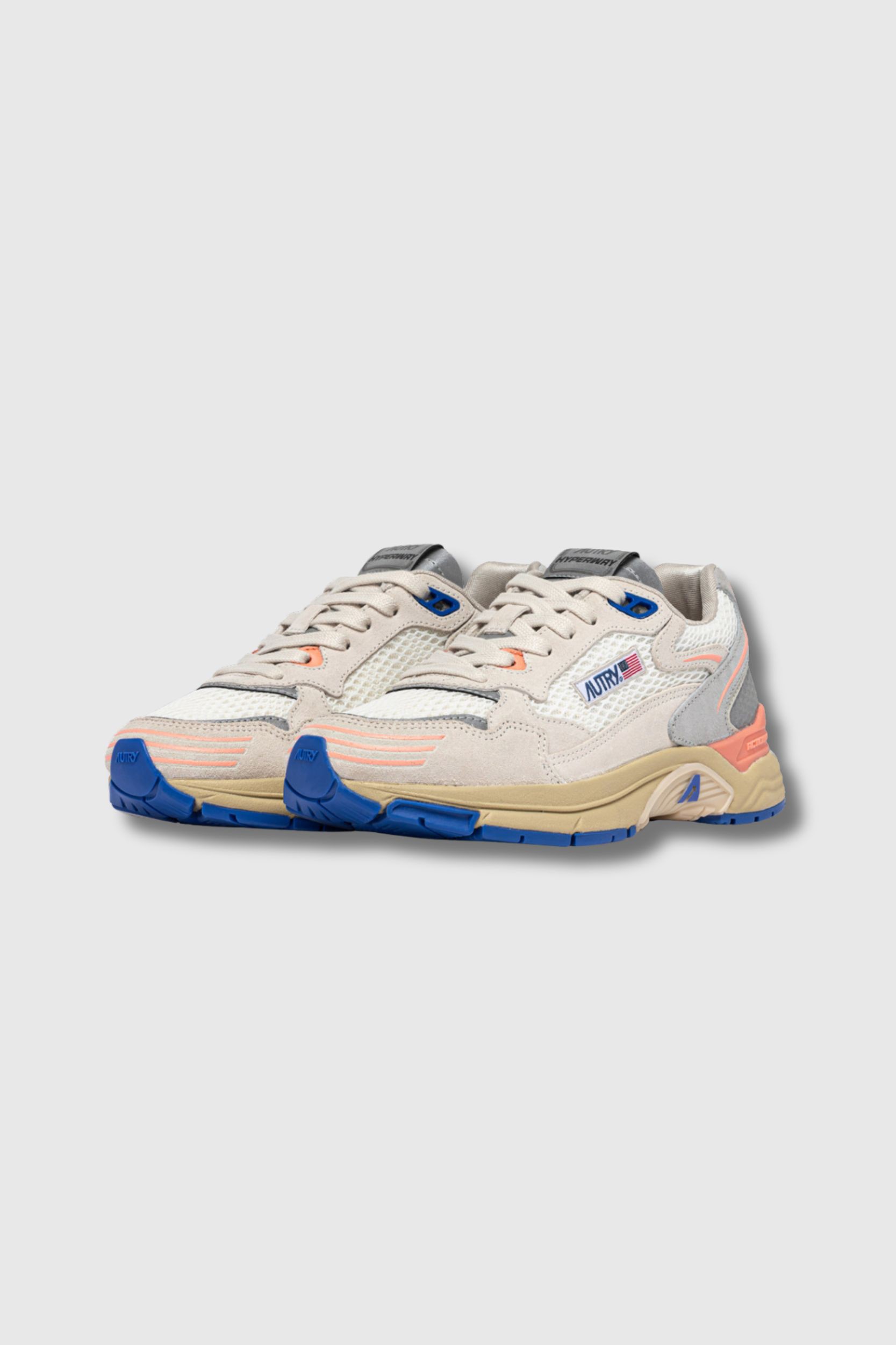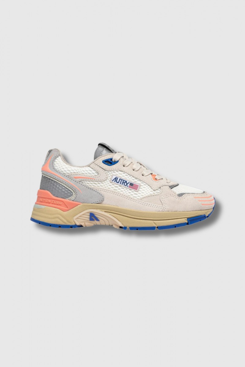 These Hyperway trainers in white/peach mesh and suede by Autry combine running style with urban aesthetics. The upper combines lightweight, breathable mesh with suede panels for optimal comfort and a sophisticated touch. The sole features Action Cush technology for superior cushioning and a comfortable walking experience. The nylon tongue, embossed leather heel counter, jacquard label and side logo emphasise the authenticity of the model. Finishing touches include a mesh toe cap, flat cotton laces, a padded mesh collar and a cotton terry lining.