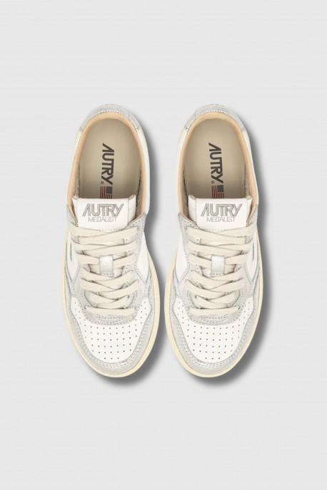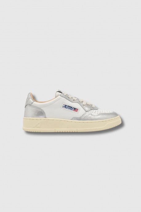 These silver and white two-tone Medalist trainers by Autry reinterpret the tennis style of the 1980s with a contemporary twist. The colour-block leather upper combines white and silver, with a perforated front for breathability. Flat cotton laces, a padded collar and leather and terry cloth lining ensure comfort and support. Timeless and versatile, these women's trainers combine classic elegance with streetwear spirit, ideal for an everyday look that combines style and comfort.