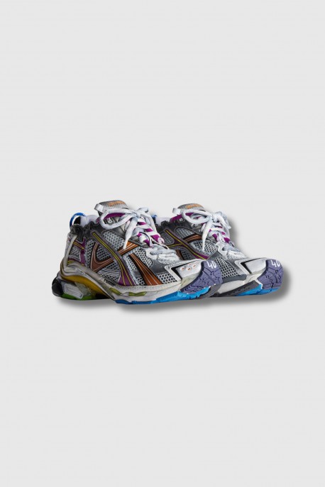 These multicoloured mesh and nylon Runner trainers by Balenciaga combine urban style with contemporary comfort. Designed without leather, they feature a worn effect that enhances their casual, modern look. The size is printed on the edge of the upper and embossed on the back, while the Runner logo appears on the outer side. The Balenciaga logo is embroidered on the tongue and affixed to the heel, complemented by a rear tab for easy slip-on. An iconic sneaker, combining bold graphics with the brand's strong identity.