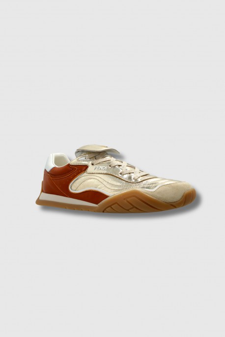 These bronze and gold leather sneakers are by Fendi. Designed for women who value elegance and functionality, they feature a dazzling gold leather with brown and beige accents. The thick contoured sole provides grip and stability, while subtle metallic details add refinement and a unique touch.