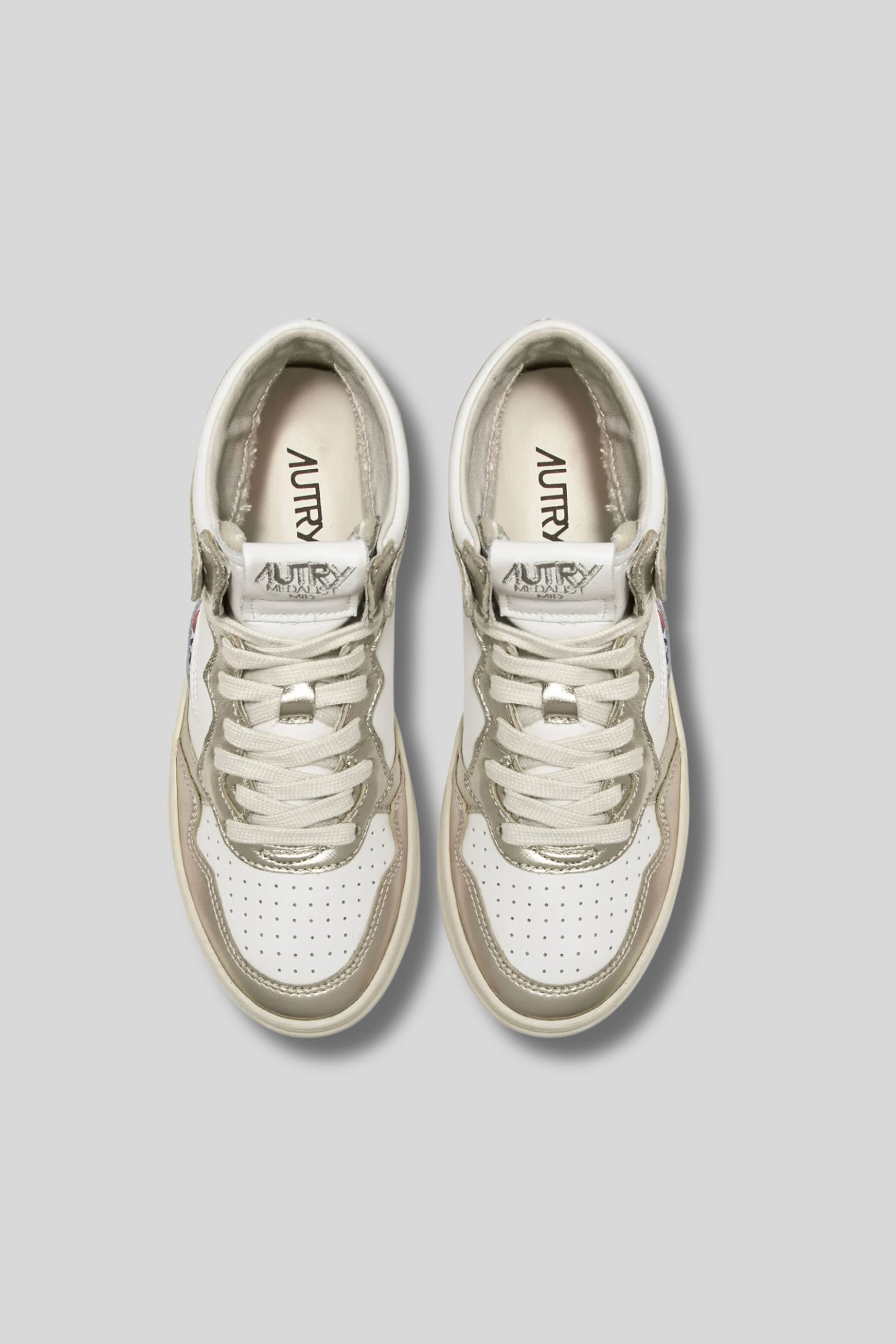 These Medalist Mid sneakers, crafted from white and platinum leather, are designed by Autry. They stand out with their bold color-block design, combining white leather with metallic platinum leather. Featuring a padded collar and a natural rubber sole, they provide exceptional comfort. The leather insole is slightly elevated by 2 cm, while the rubber outsole, with a vintage effect, boasts a thickness ranging from 2.5 to 3.5 cm.