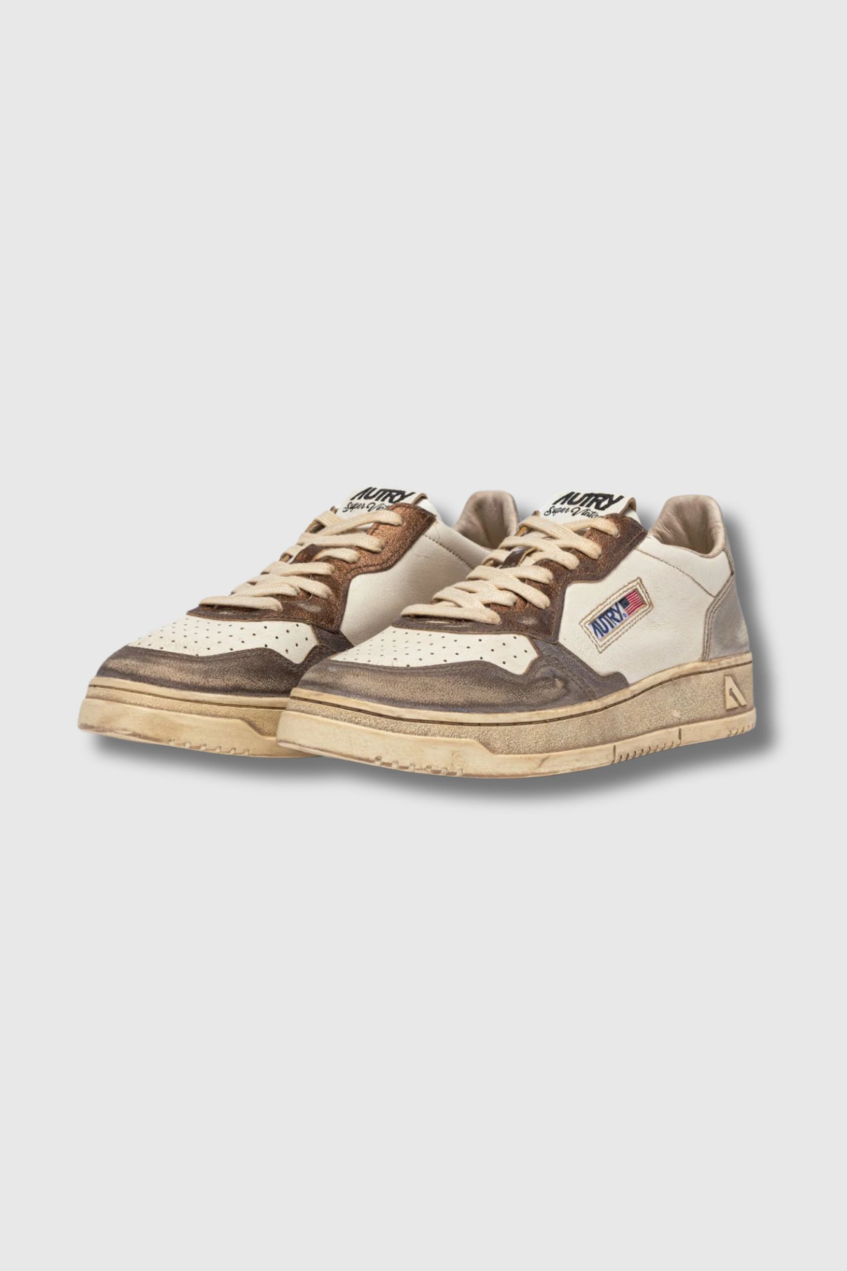 The Medalist Super Vintage choco and silver trainer designed by Autry combines retro tennis design with modern comfort. Crafted in supple white leather with a distressed look, it features platinum and silver laminated leather inserts, enhanced by unique artisanal finishes that make each pair exclusive.