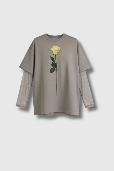 The design stands out through a layered trompe-l’œil effect: a relaxed short-sleeve silhouette combined with long sleeves in viscose mesh, adding lightness and subtle transparency. A rose print on the front softly contrasts with the neutral tone of the garment, bringing a poetic touch to the overall look.