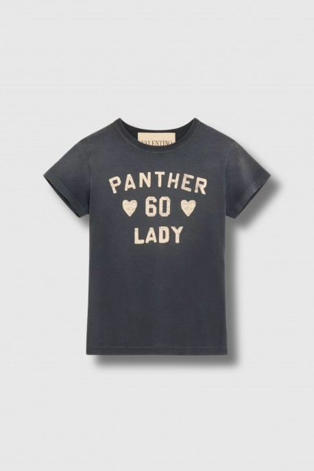 This black Panther T-shirt by Valentino Garavani captivates with its graphic and contemporary look. Crafted from 100% cotton jersey, it offers a soft feel and optimal comfort. Its Panther Lady print adds a bold and iconic touch, contrasting elegantly with the sky blue background. An expressive and modern piece, ideal for energising a casual look with a bold couture signature.