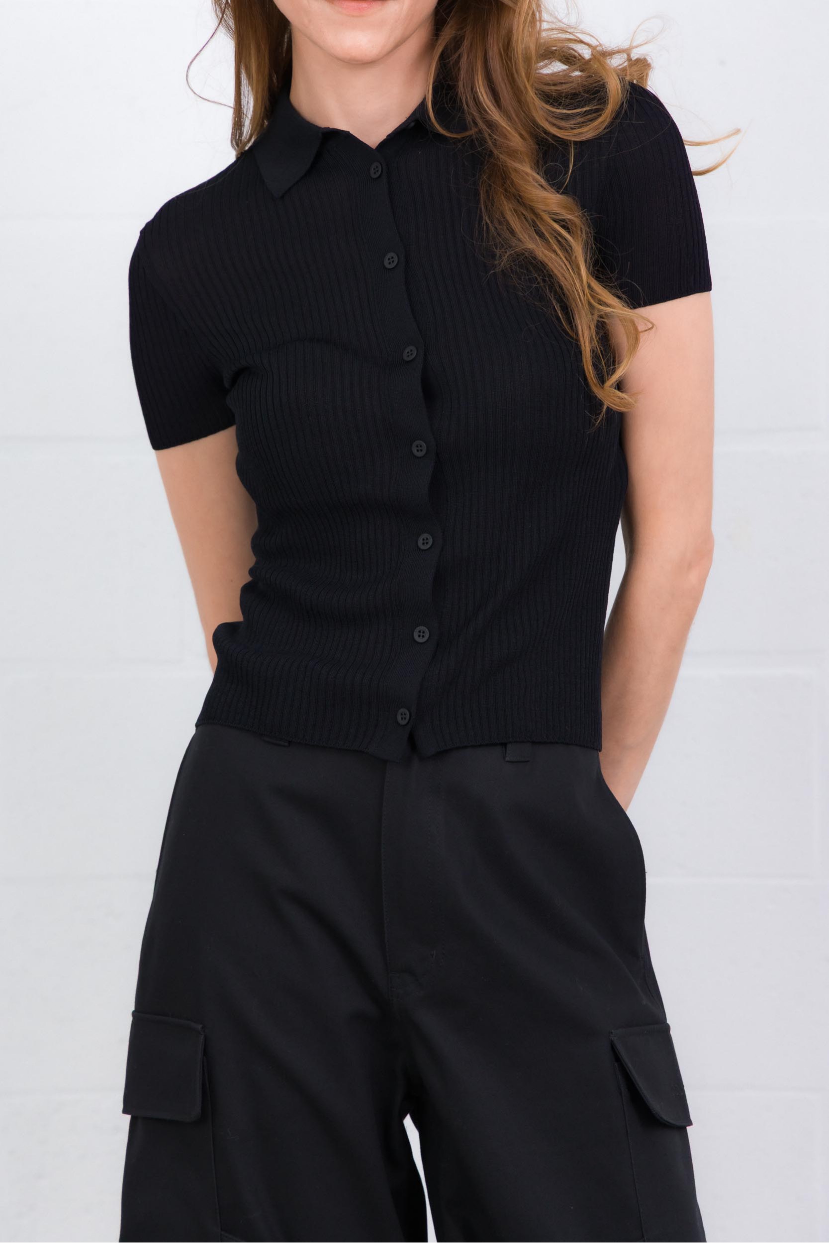 This black button-down T-shirt by Balenciaga revisits a classic with minimalist elegance. Crafted from fine ribbed viscose and cotton knit, it offers a fitted and comfortable silhouette. Its flat collar and short sleeves reinforce its sleek look, while the eight Balenciaga-engraved buttons on the front add a discreet and refined signature. The Balenciaga logo embroidered on the collar completes this understated and contemporary design.