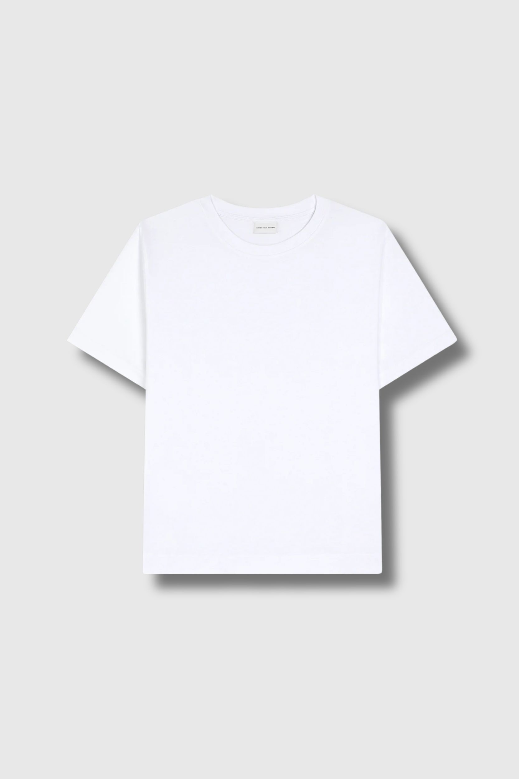 The white Heydu T-shirt by Dries Van Noten embodies the essence of sophisticated minimalism. Crafted from 100% cotton, it provides natural comfort and refined simplicity. Featuring a regular fit, short sleeves, and a crew neckline, it is a timeless wardrobe essential designed for discreet and versatile elegance.