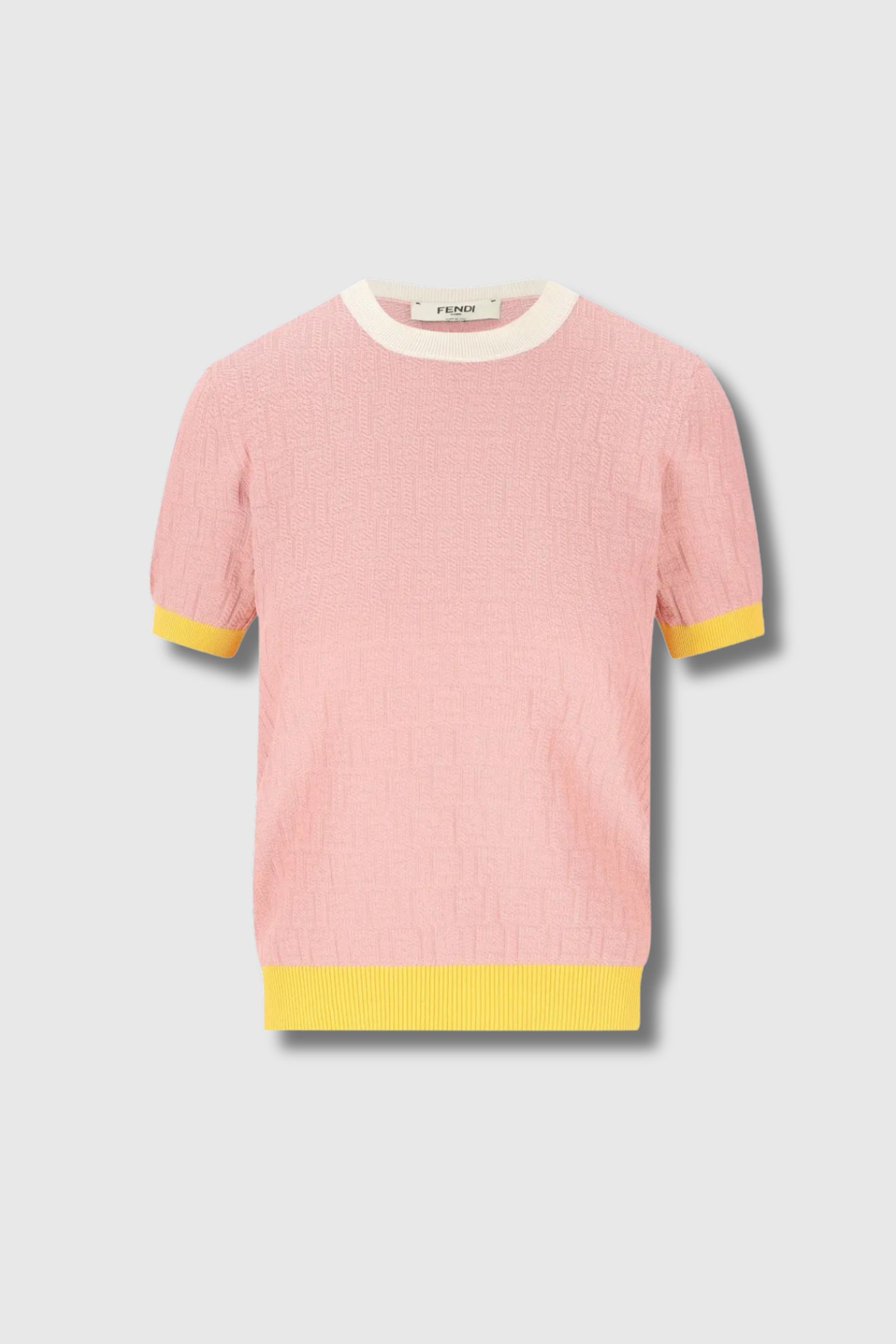 This FF logo T-shirt in pink, yellow, and white is by Fendi. It features a straight fit with a classic round neckline. The all-over embossed FF monogram gives it a bold yet refined and modern signature.