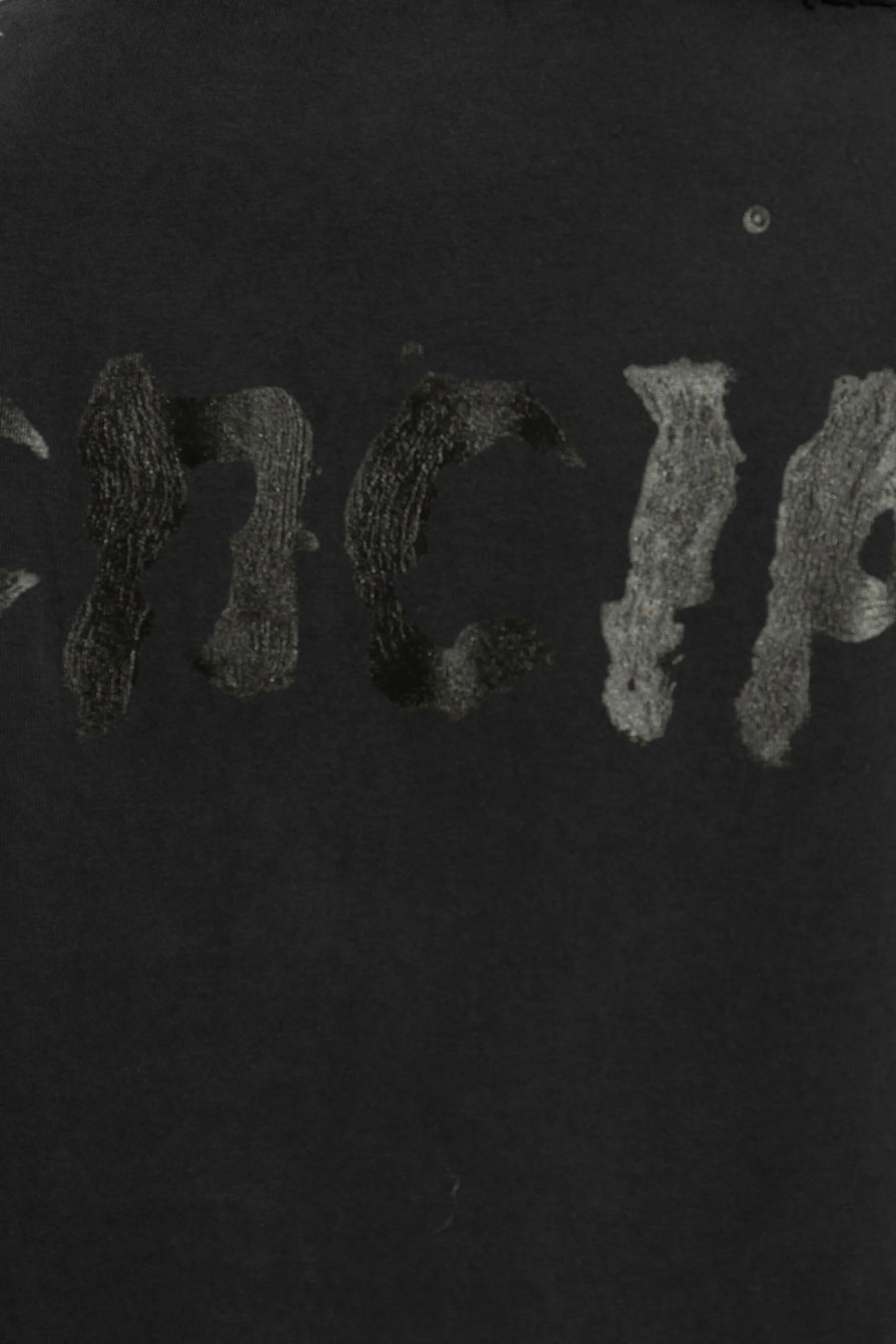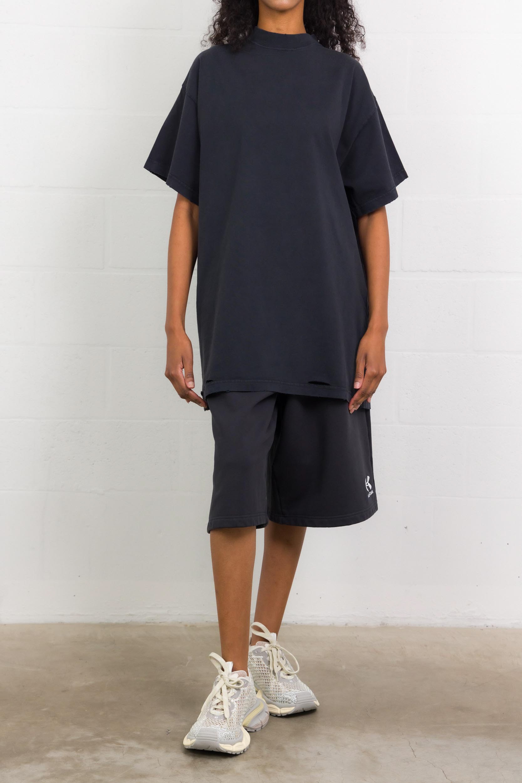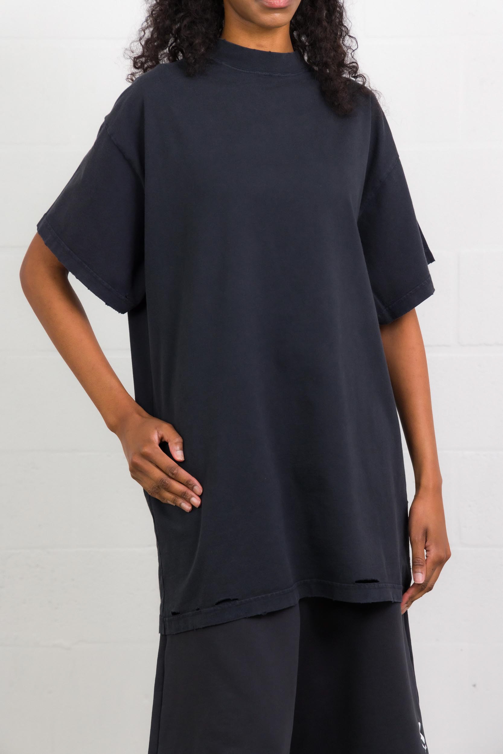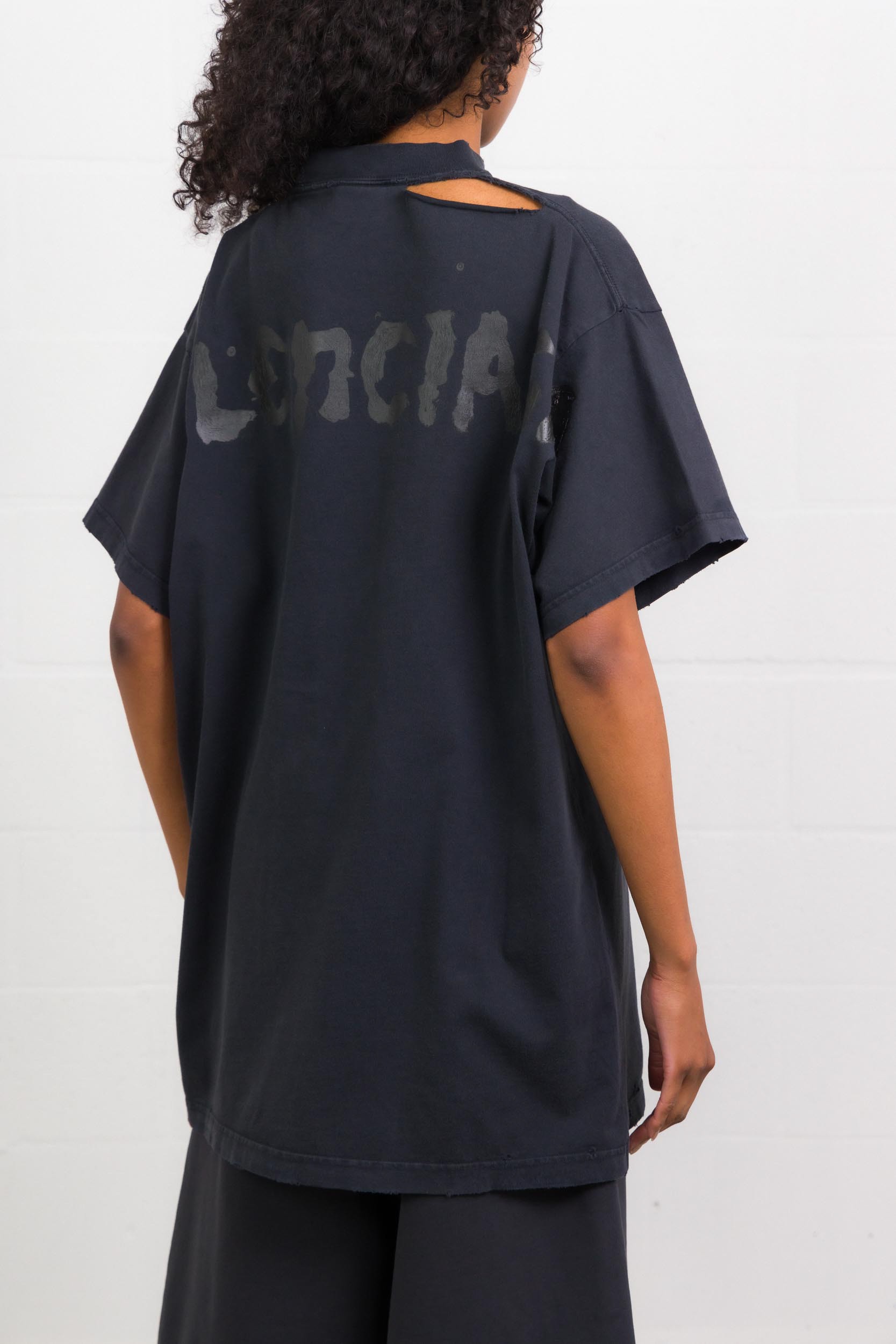 This black cotton t-shirt with tonal logo on the back is designed by Balenciaga. It features a round neck, short sleeves and the brand's tonal logo print on the back. Long oversized cut.