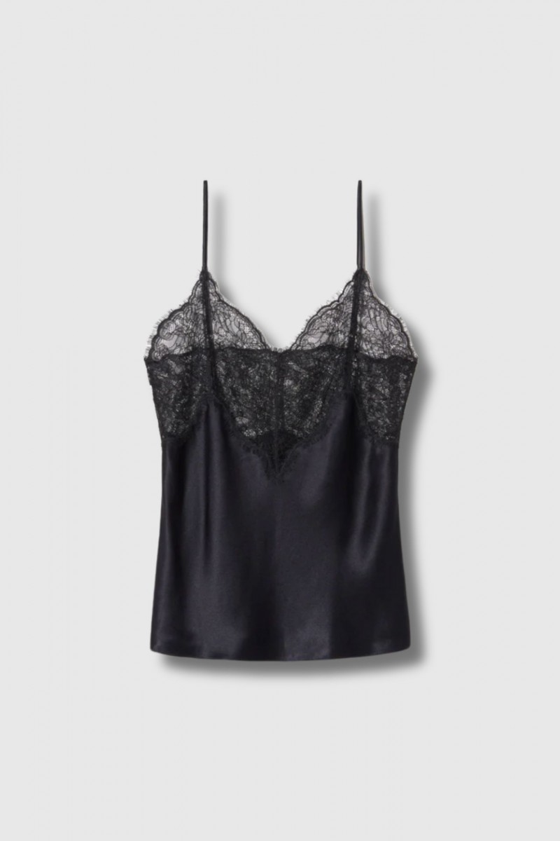 This black silk and lace camisole is designed by Nili Lotan. Enhance your silhouette with this sheer lace piece with delicately scalloped edges and adjustable straps for a perfect fit. The flirty silk panel, enhanced by an ultra-feminine eyelash finish, offers sensual, refined elegance.