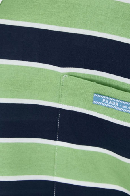 This long-sleeved green striped jersey top by Prada combines comfort with contemporary style. Its loose fit ensures ease and fluidity, while the white yoke detail at the collar and chest pocket add a graphic and refined touch. The long sleeves and striped pattern give it a modern, relaxed look, making this top a versatile piece, ideal for a casual-chic look.