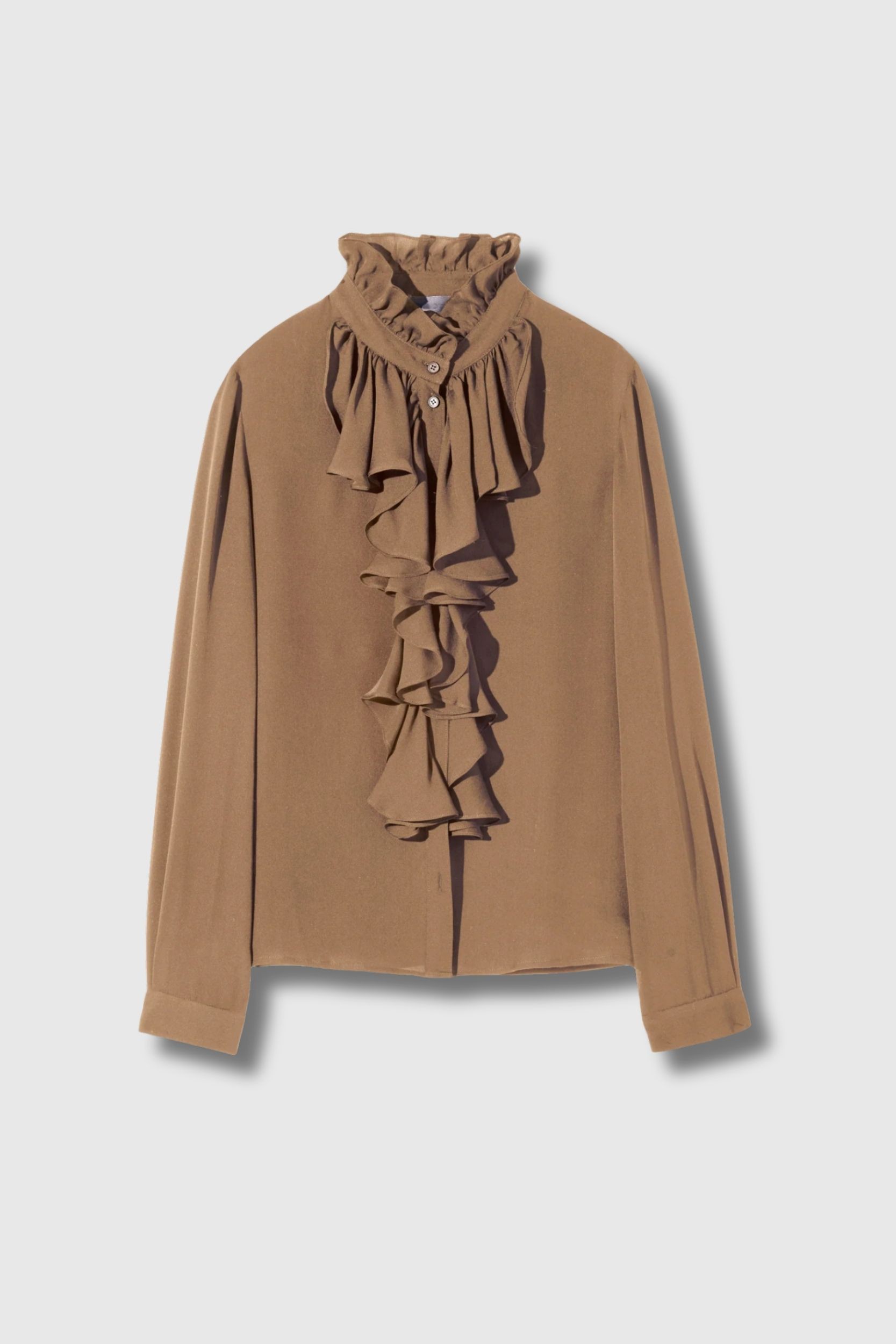 This cognac-coloured Lili blouse by Nili Lotan charms with its delicate elegance and romantic spirit. Crafted from a slightly sheer fabric, it features a ruffled collar with a structured collar band and a ruffled front panel that adds movement and softness to the silhouette. The buttoned cuffs and straight hem balance the overall look with understated elegance. A refined piece, ideal for enhancing tailored trousers or sleek jeans with a feminine and sophisticated touch.