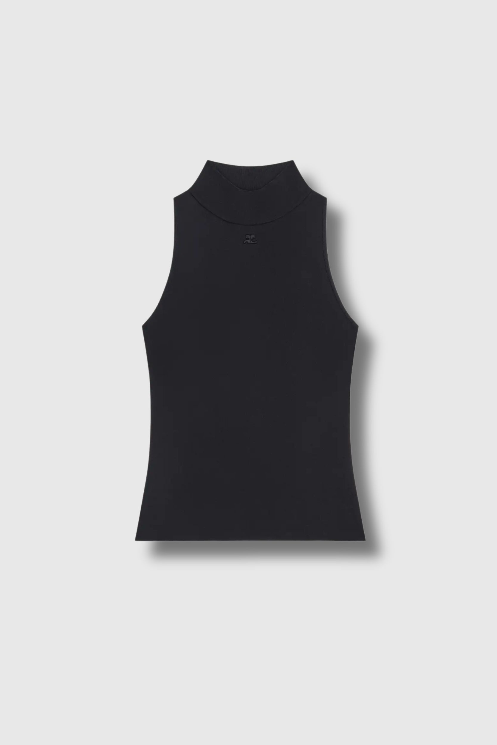 This black Heritage sleeveless top by Courrèges embodies the brand's iconic, minimalist aesthetic. Crafted from structured knit fabric, it features a graphic stand-up collar that modernises the silhouette. Its sleek design is enhanced by the AC logo embroidered below the neckline, a discreet and emblematic signature. A timeless and versatile piece, ideal for creating looks that are both contemporary and elegant.
