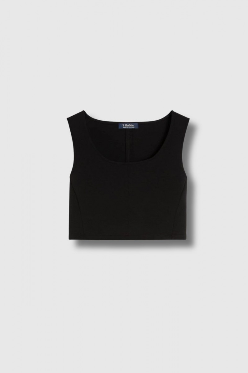 This black cropped bustier top is by Max Mara. Crafted from cotton-blend scuba jersey, it features a fitted silhouette enhanced by cut-out detailing. Designed with a wide round neckline, broad straps, and a sleeveless cut, it combines structure with modern elegance.