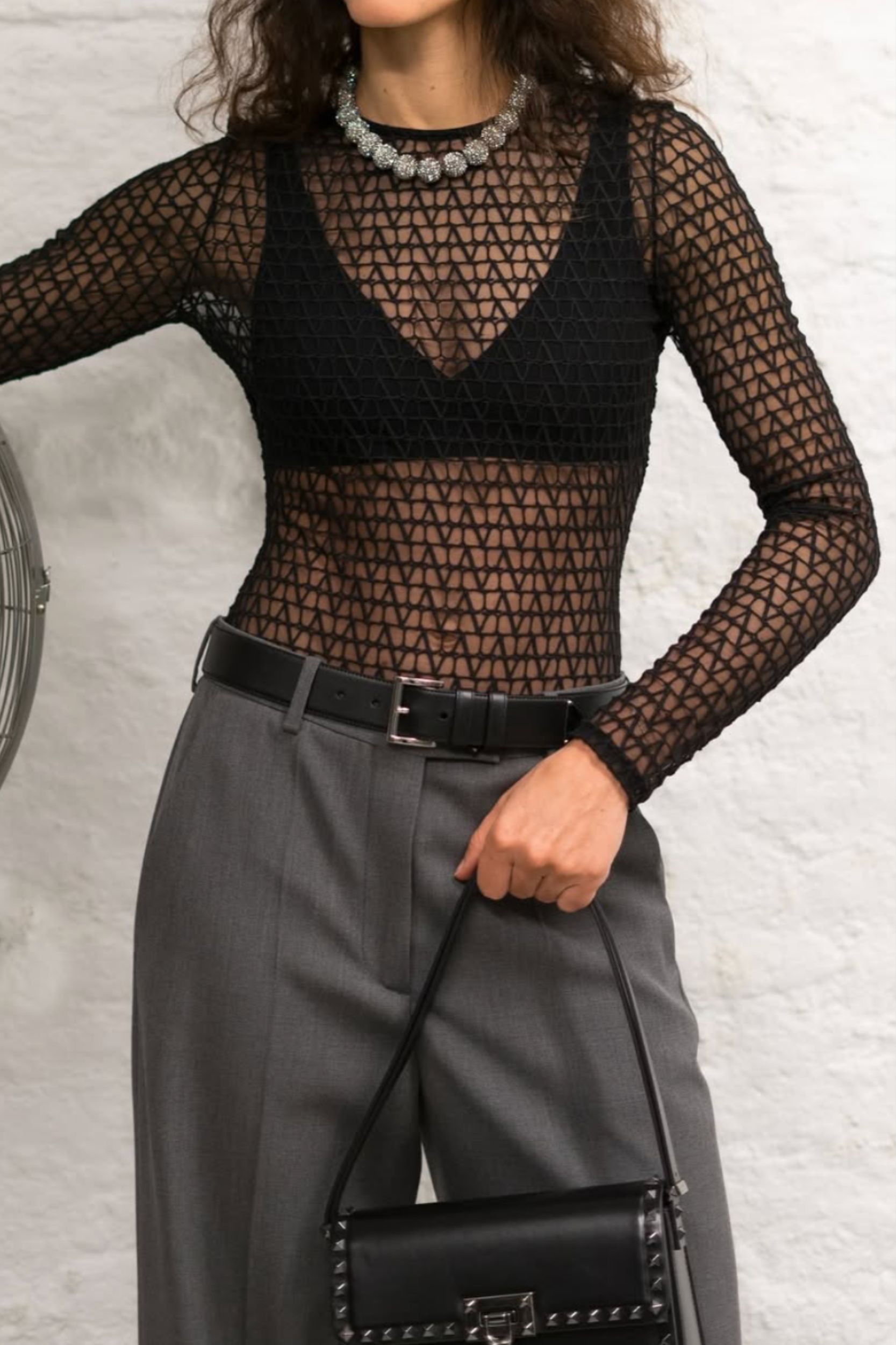 This black Toile Iconographe tulle bodysuit is designed by Valentino. It features a buttoned closure at the back.