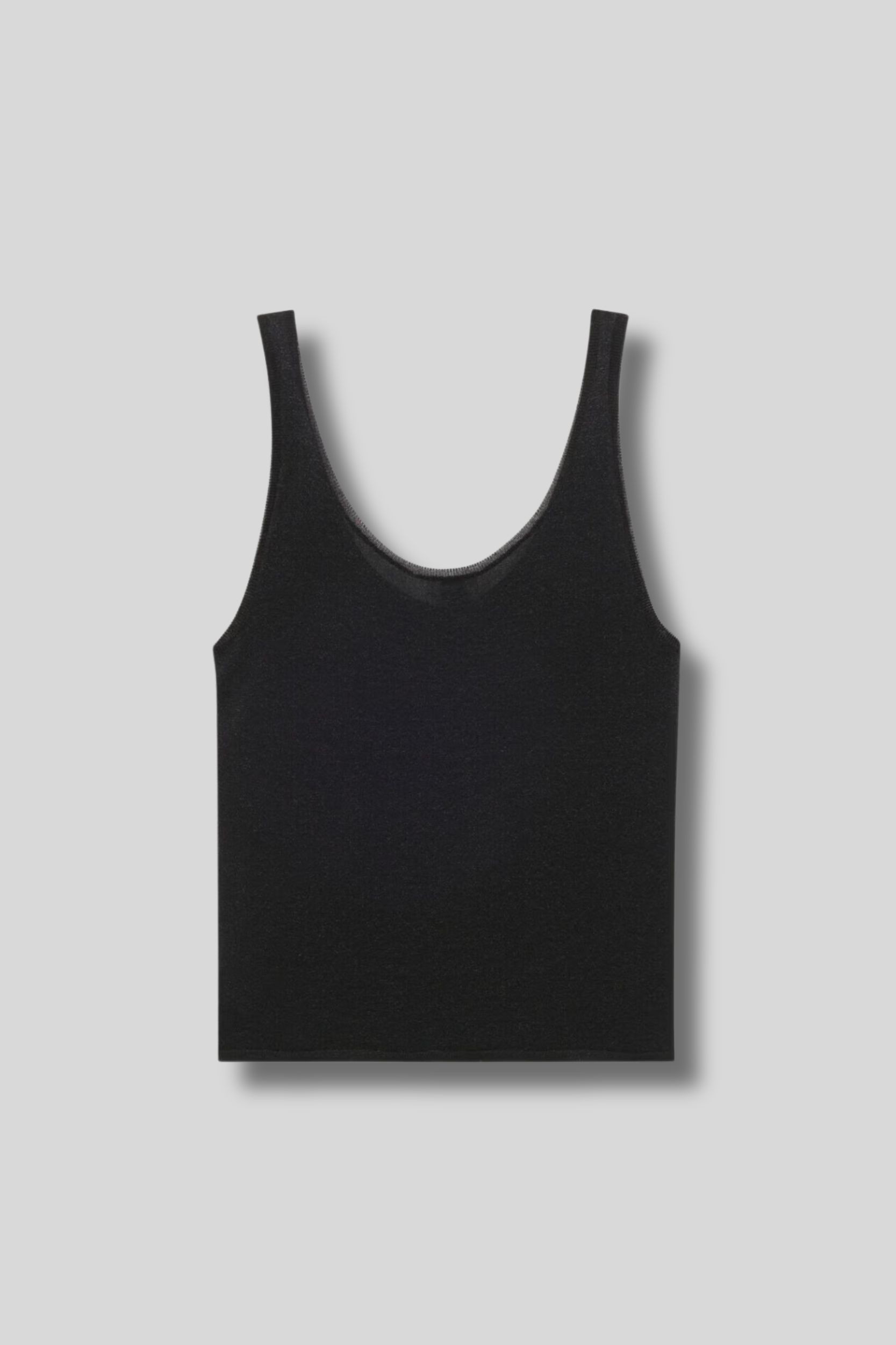 This black lurex mesh tank top is designed by Saint Laurent. It has a rounded scoop neckline at the front and back.