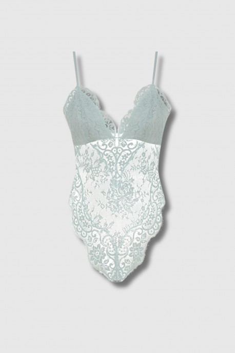 This white lace Teddy bodysuit is designed by Zimmermann. It has an invisible fastening at the back and adjustable straps. This piece is cut close to the body.