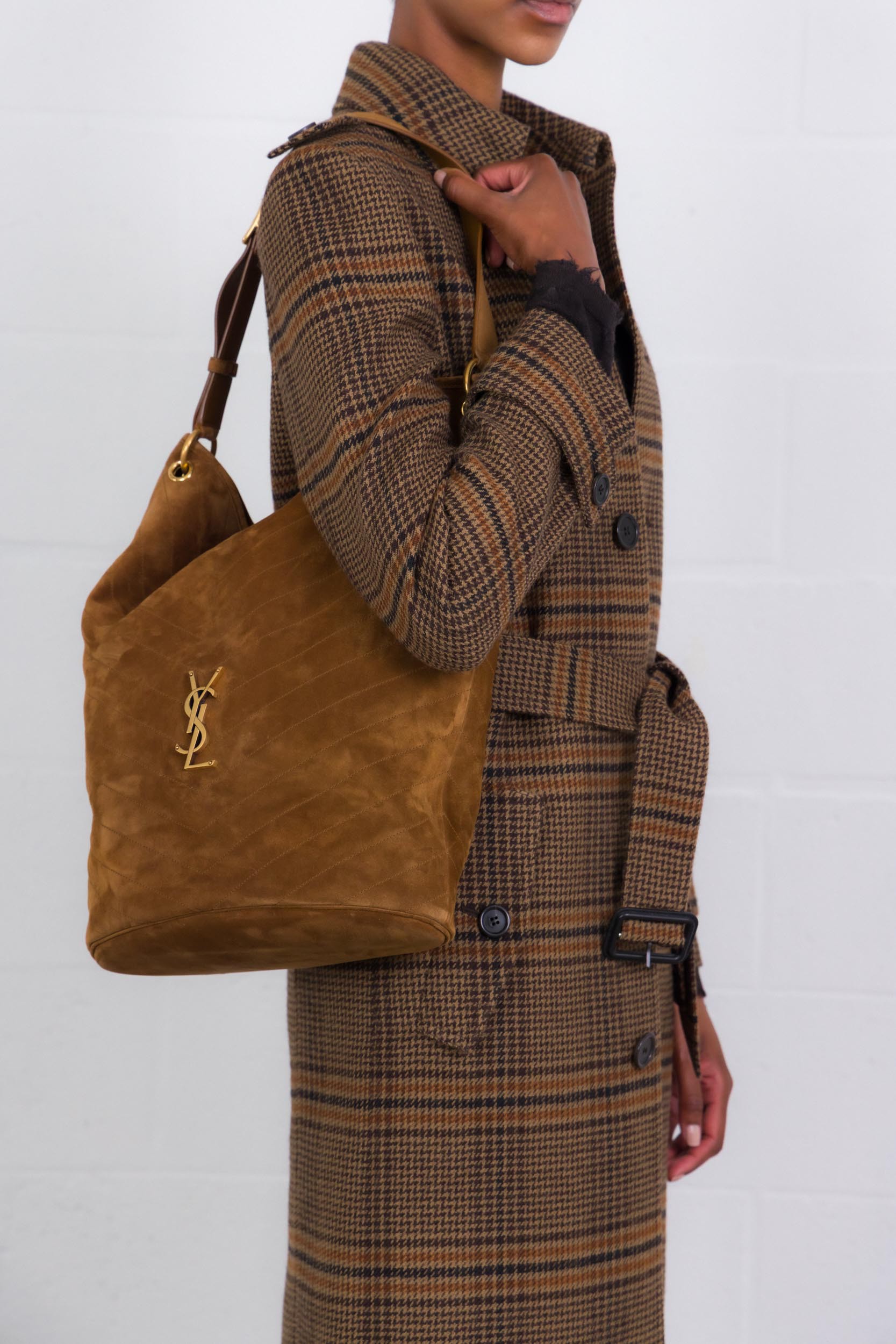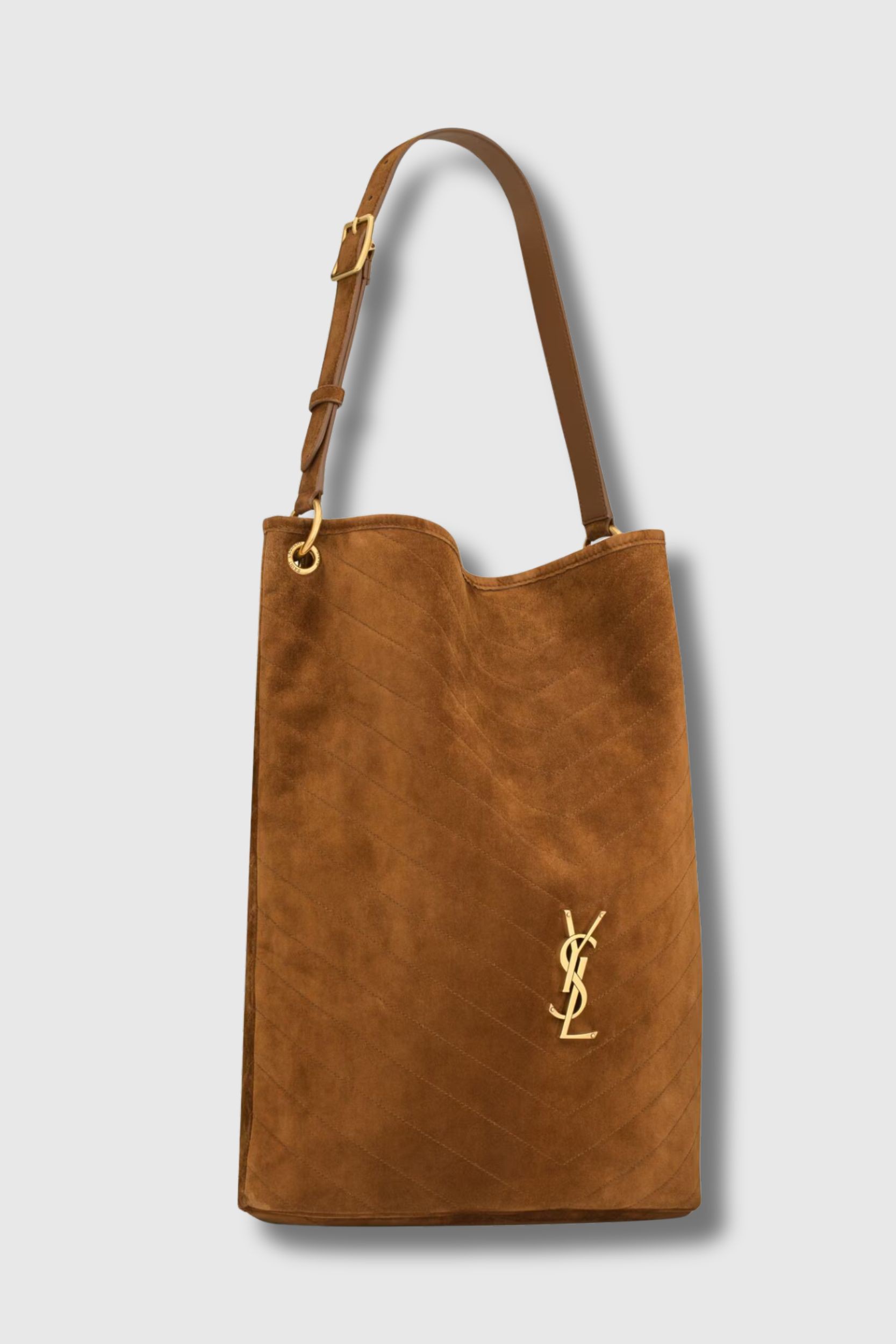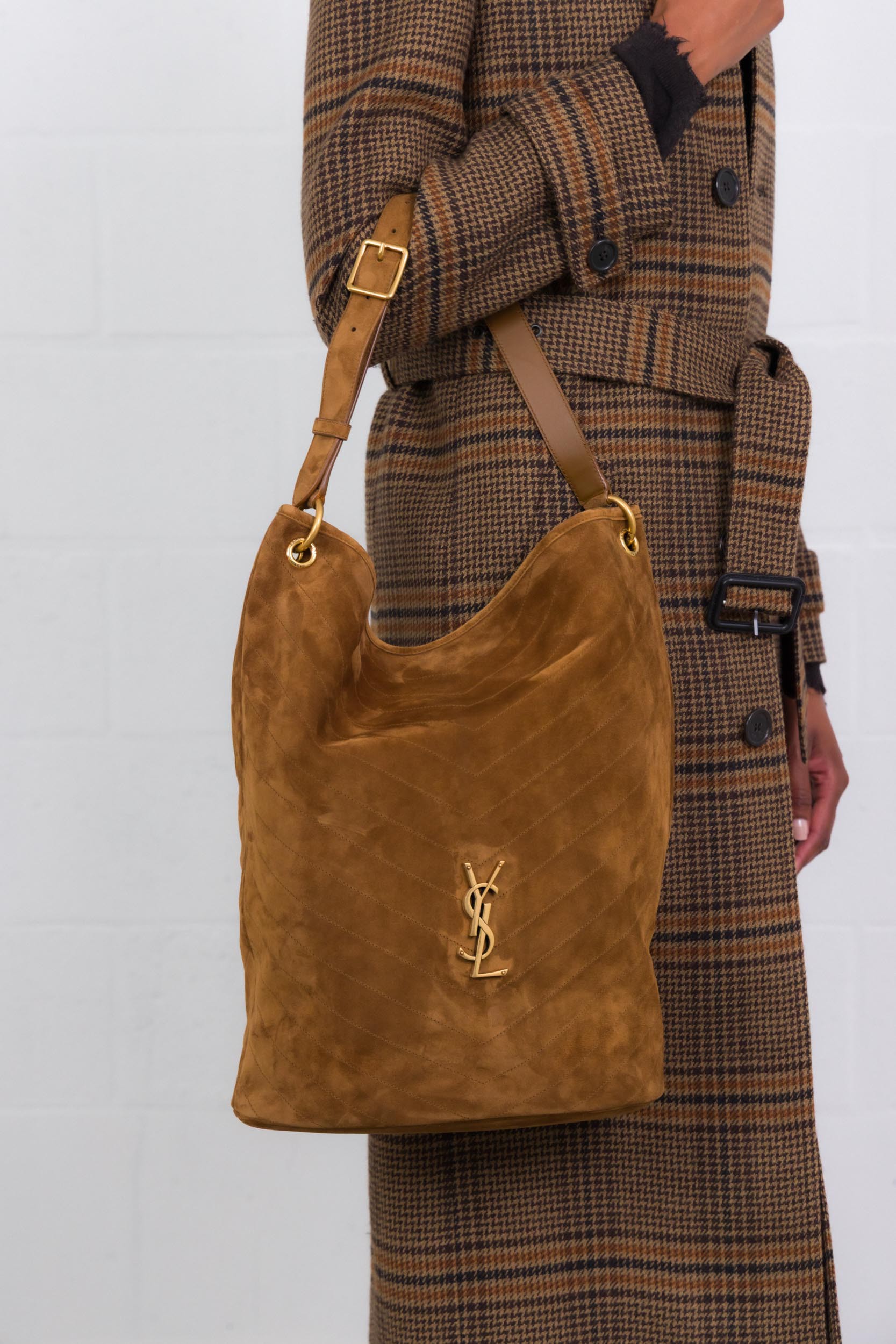This Saint Laurent's ‘Niki Supple Bucket’ bag in cognac caramel suede is a modern take on the brand's iconic aesthetic. Crafted in remarkably fine suede calf leather, its generous volume combines bucket spirit with a fluid silhouette, embellished with chevron stitching and the discreet Cassandre clasp.