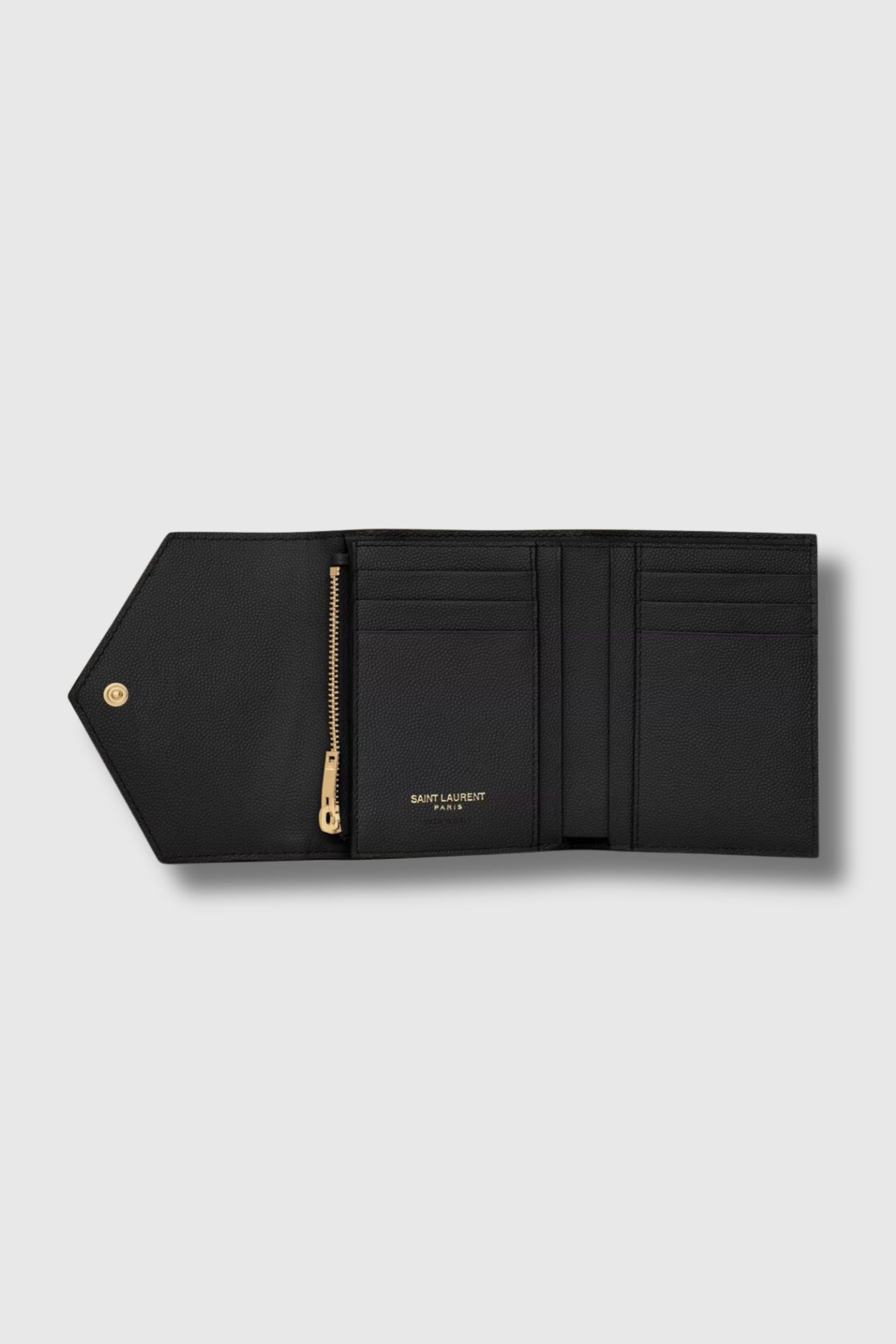 Ce portefeuille Cassandre en cuir noir grain de poudre signé Saint Laurent séduit par son format compact et son allure iconique. Orné du monogramme Cassandre et de surpiqûres matelassées, il est confectionné en cuir tanné sans chrome ni métal et doublé de cuir. Pratique et raffiné, il s’ouvre sur six fentes à cartes, une poche zippée, une fente à billets et quatre poches internes, complété par une poche plaquée à l’arrière. La bijouterie en laiton doré et la fermeture à bouton-pression viennent parfaire ce modèle intemporel.