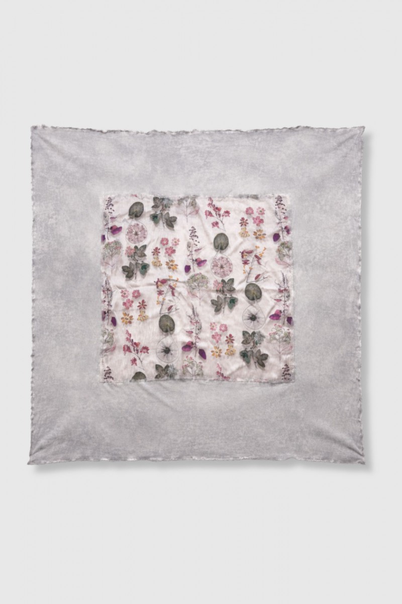 Sa base argentée, aux nuances délicatement patinées, est rehaussée d’un empiècement central à imprimé floral, apportant une touche poétique et contrastée. Les finitions légèrement effilochées et la teinture artisanale traduisent le savoir-faire unique de la maison.