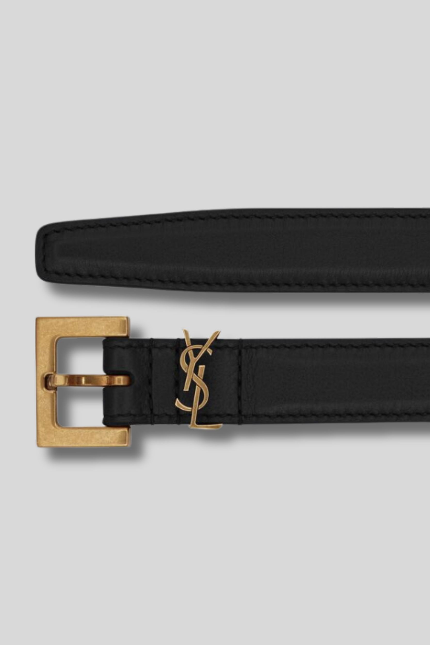 Cette ceinture Cassandre en cuir lisse noir est signée Saint Laurent. Celle-ci présente le Cassandre doré sur l'avant de la pièce.