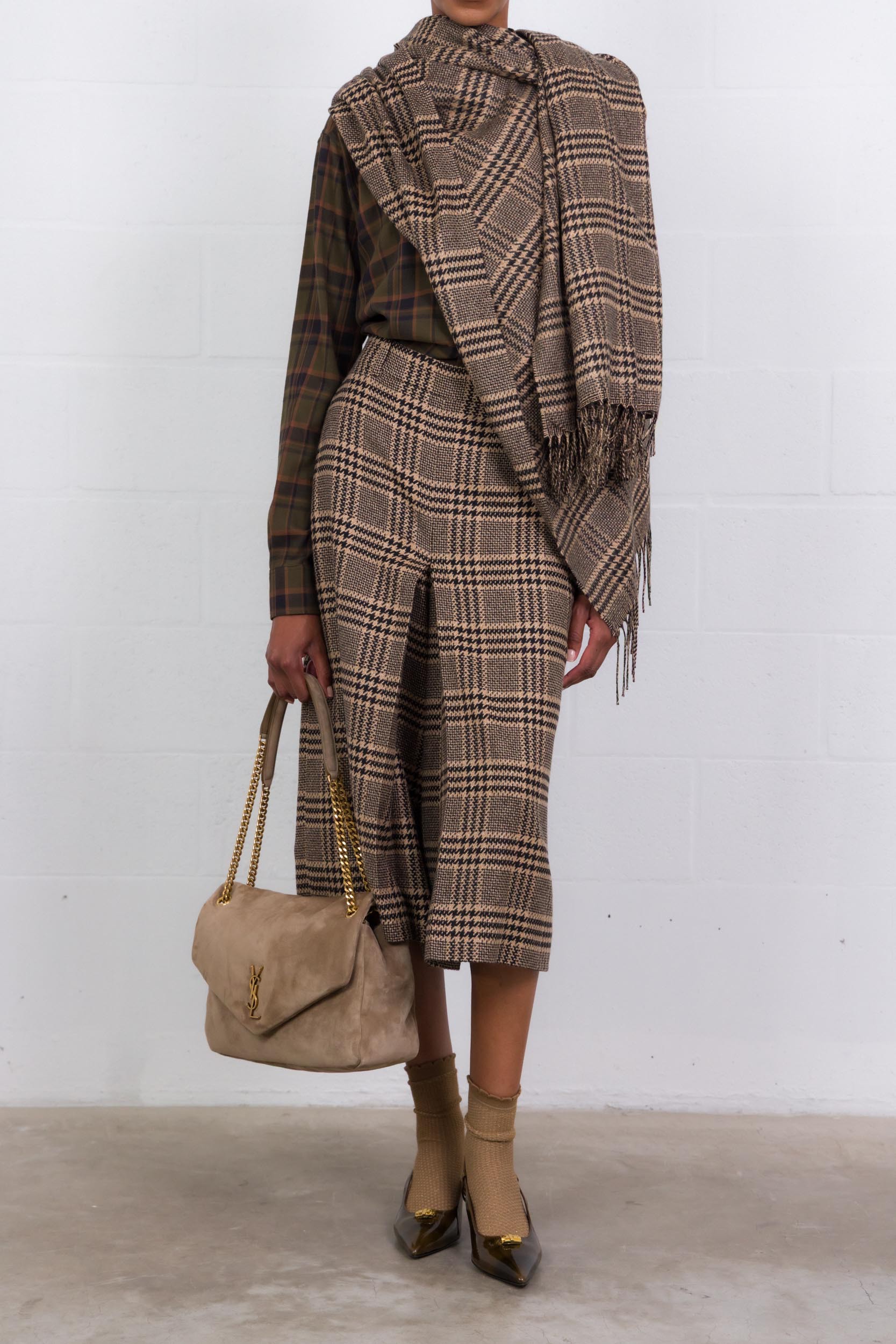 Le modèle d’écharpe "Prince de Galles" en soie et cachemire signé Saint Laurent incarne l’élégance intemporelle de la maison. Tissé dans un mélange noble de soie certifiée et cachemire, ce long carré adopte un motif prince de Galles discret en nuances de noir et beige. Ses bords frangés ajoutent une touche raffinée à son allure classique.