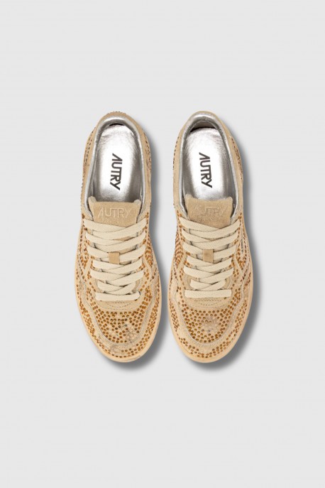 Ces baskets Medalist strass beige sont signées Autry. Issues de la capsule Bloom, elles réinventent l’iconique silhouette Medalist avec une touche glamour. Réalisées en daim et parées de micro-strass scintillants, elles associent élégance et confort grâce à leur col rembourré, leur doublure en cuir et coton-éponge, ainsi qu’une semelle en caoutchouc surélevée. Un modèle raffiné et lumineux, livré avec sa pochette personnalisée en tissu.