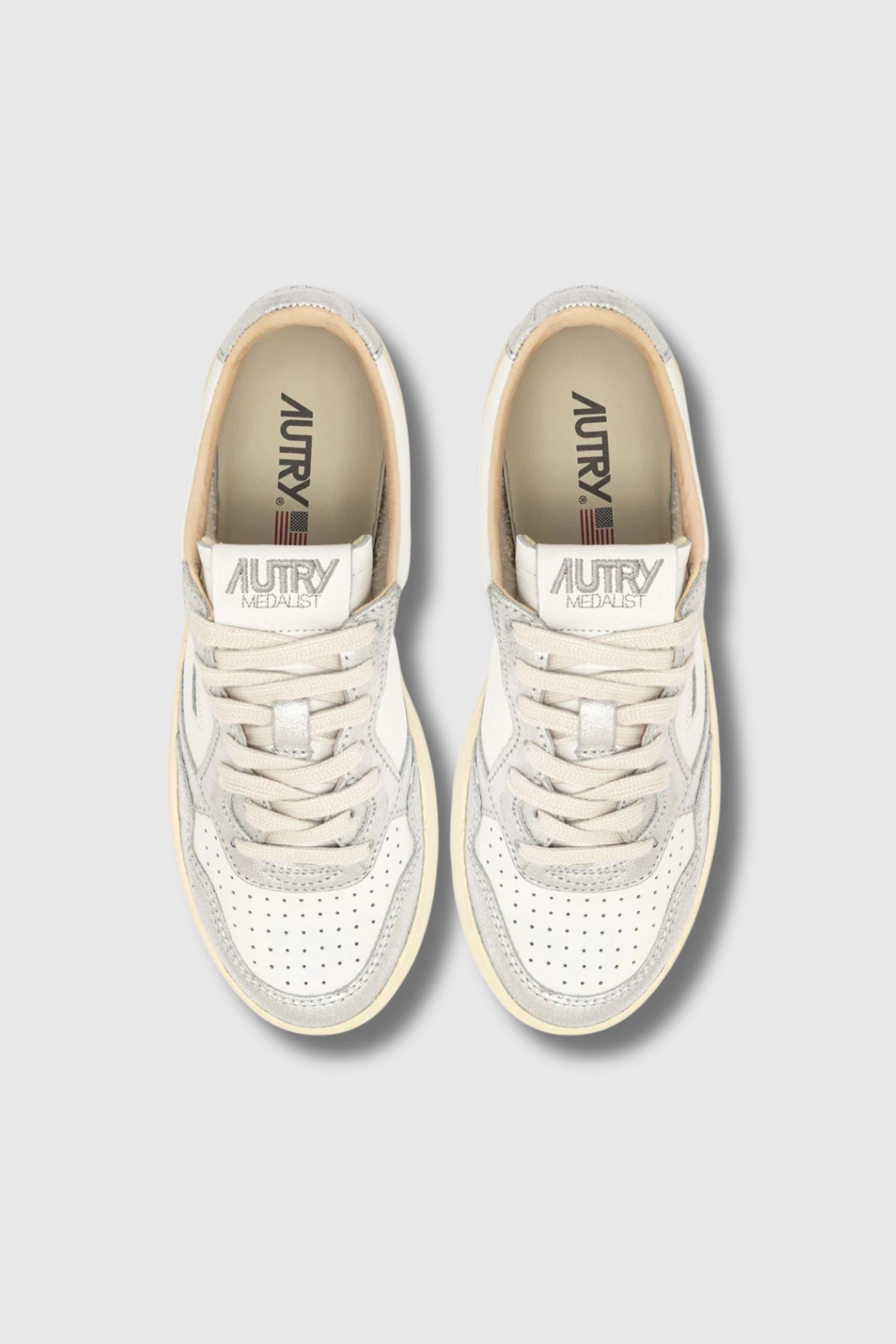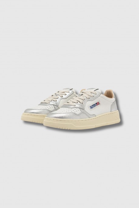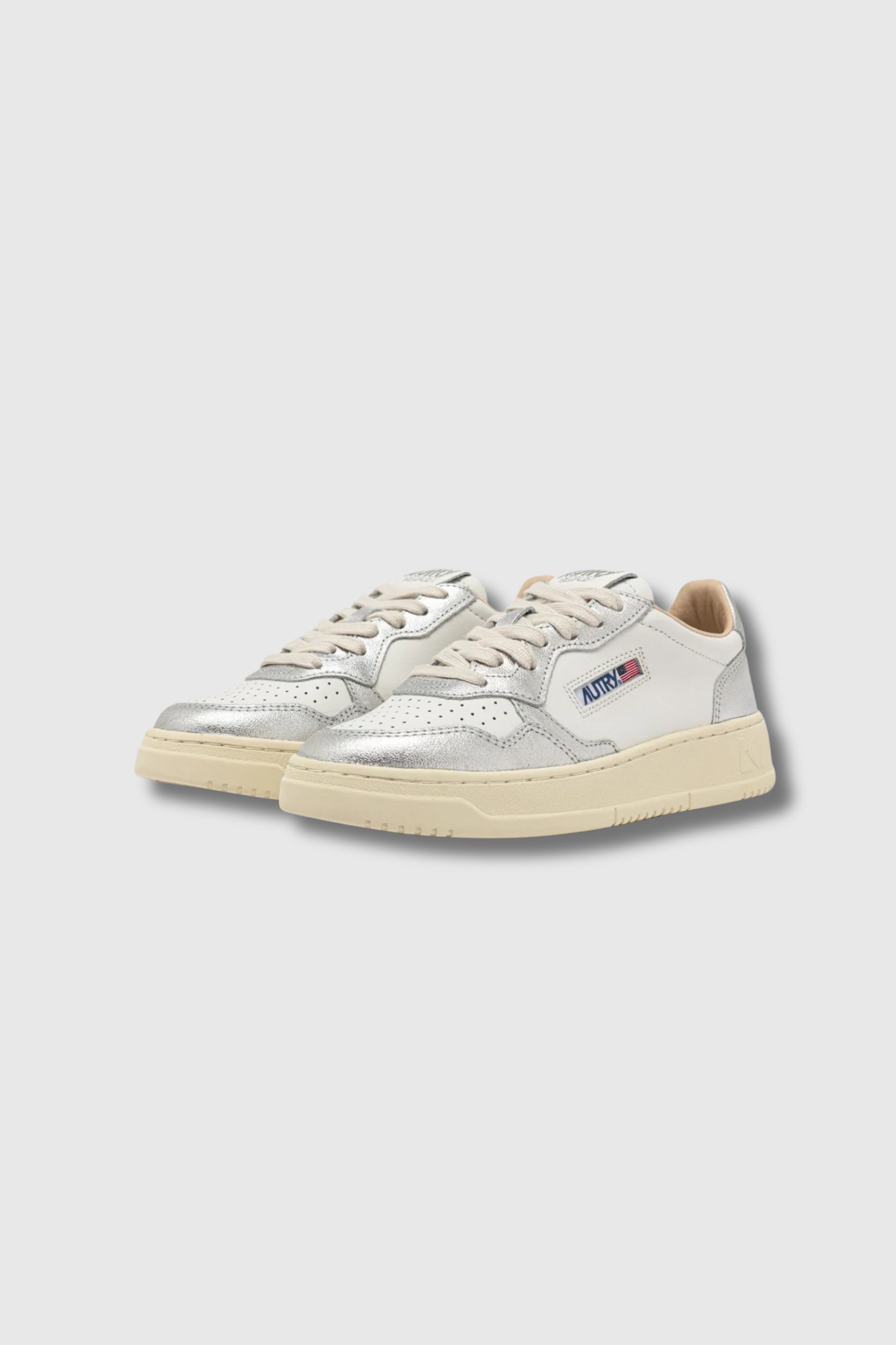 Ces baskets Medalist bicolores argent et blanc signées Autry réinterprètent le style tennis des années 80 avec une touche contemporaine. La tige en cuir color block combine blanc et argenté, avec un avant perforé pour respirabilité. Les lacets plats en coton, le col rembourré et la doublure en cuir et éponge assurent confort et maintien. Intemporelle et polyvalente, cette sneaker féminine allie élégance classique et esprit streetwear, idéale pour un look quotidien alliant style et confort.