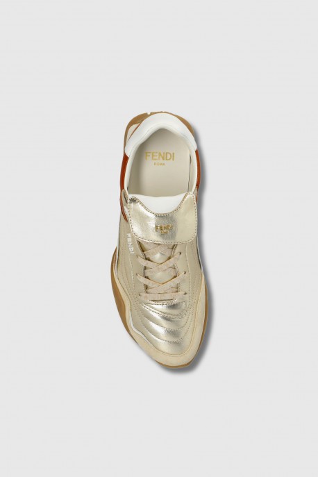 Ces Baskets en cuir bronze et doré sont signées Fendi. Conçues pour les femmes recherchant élégance et fonctionnalité, elles combinent cuir doré éclatant avec des touches marron et beige. La semelle épaisse et sculptée offre adhérence et stabilité, tandis que les détails métalliques subtils apportent raffinement et singularité.