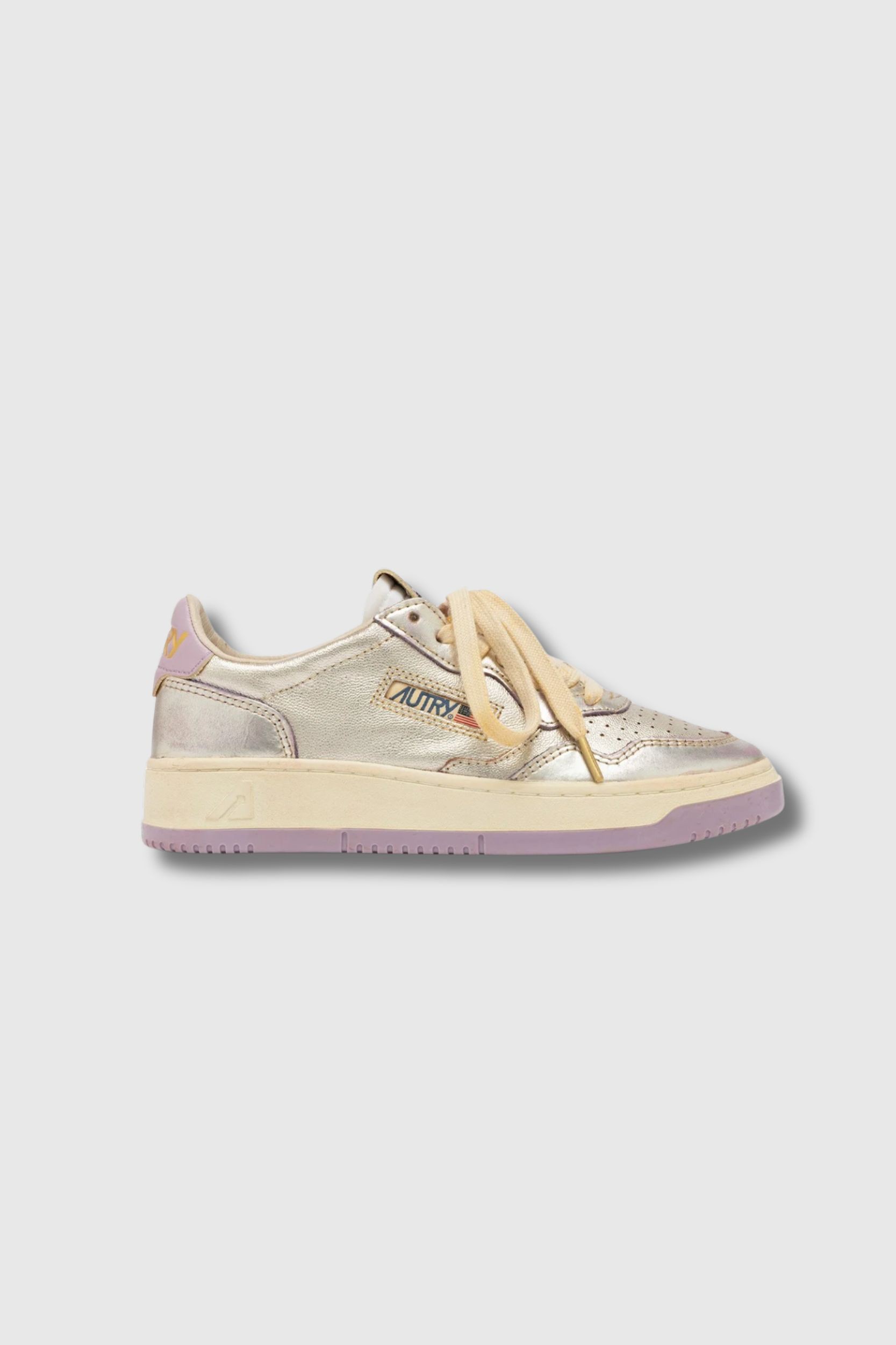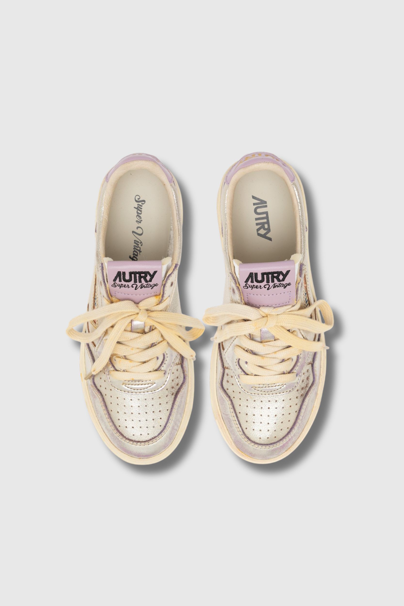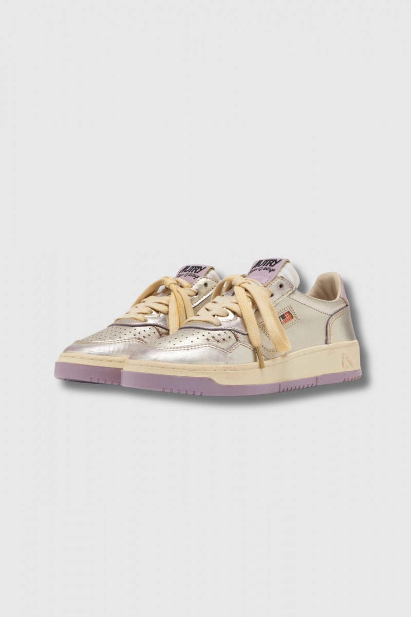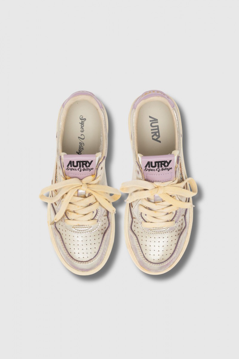 Ces baskets Super Vintage en cuir lilas et platinum sont signées Autry. Inspirées du style des années 80, elles associent design rétro et finition artisanale réalisée à la main en Italie pour un effet volontairement usé et authentiquement vintage. Confectionnées en cuir lilas et platinum au look patiné, elles présentent une pointe micro-perforée, des lacets en coton, une étiquette brodée sur la languette et un col rembourré. Le modèle est complété par un logo jacquard latéral, une doublure en cuir et coton éponge et une semelle intérieure en cuir surélevée de 2 cm pour plus de confort.